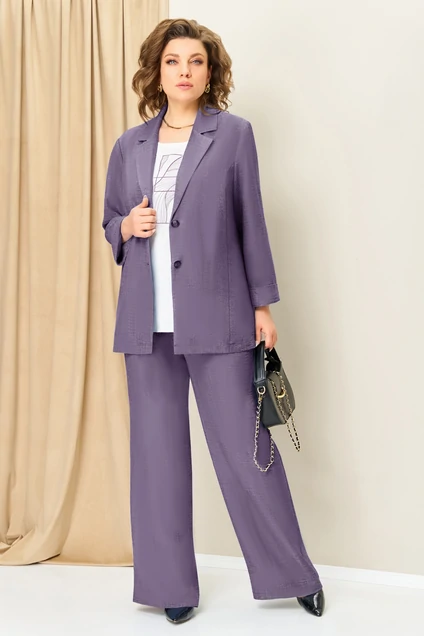 Элегантный комплект- тройка из текстиля. Жакет без подкладки с застежкой на пуговицы, с разрезами по бокам и съемным поясом. Длина жакета по центру спинки- 71см. Рукав жакета втачной, с отворотом. Длина рукава- 56см. Брюки прямые с высокой посадкой, с притачным поясом на резинке. Длина брюк по боковому шву- 100 см. Блуза с коротким спущенным рукавом. Длина блузы по спинке- 65 см. Изысканная брошь в комплекте изделия.