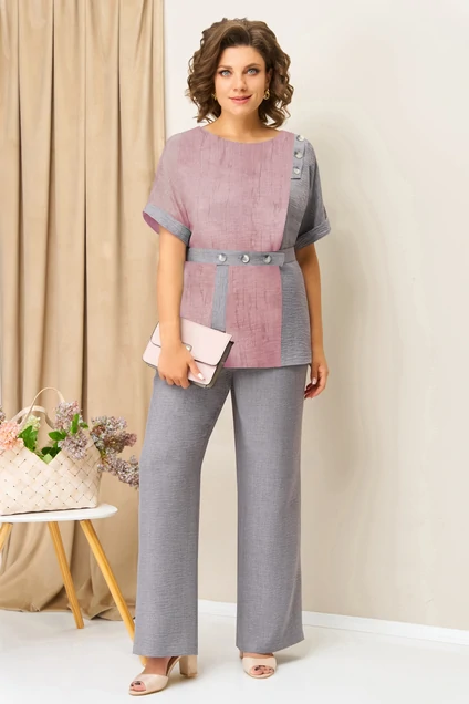 Комплект-двойка из легкого текстиля: комбинированная блуза и брюки свободного силуэта. Рукав блузы на цельнокроеной основе, длина по спинке-67см. Брюки прямые с высокой посадкой, с притачным поясом со вставками с резинкой. Длина брюк по боковому шву- 102см. Пояс из текстиля в комлекте изделия.