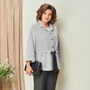 Костюм женский: жакет, брюки, блуза. Жакет с застежкой на пуговицы, с пришивной кулисой и поясом, прямые классические брюки и блуза- универсальный комплект для различных вариантов носки. Длина жакета по центру спинки- 71см. Элегантный рукав с отложной манжетой на цельнокроеной основе. Брюки прямые с высокой посадкой, с притачным поясом на резинке. Длина брюк по боковому шву- 102см. Блуза из легкого текстиля с принтом, со спущенным коротким рукавом. Длина блузы по центру спинки- 62см. Блуза: полиэстер 95%, эластан 5%.