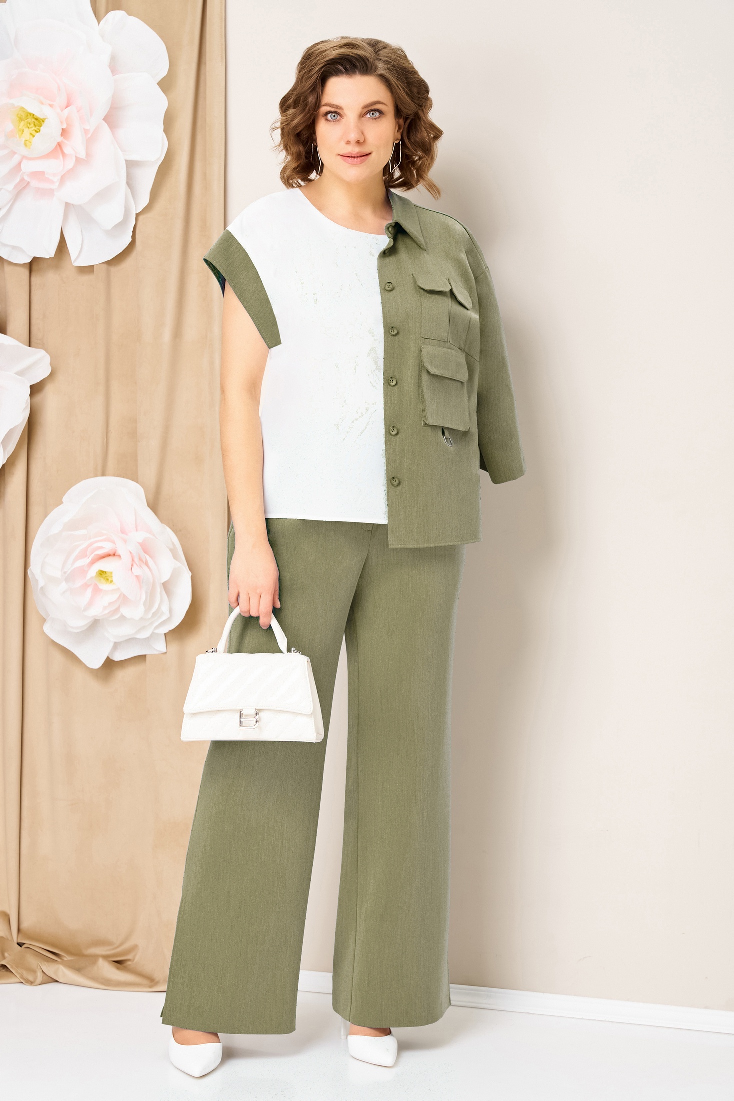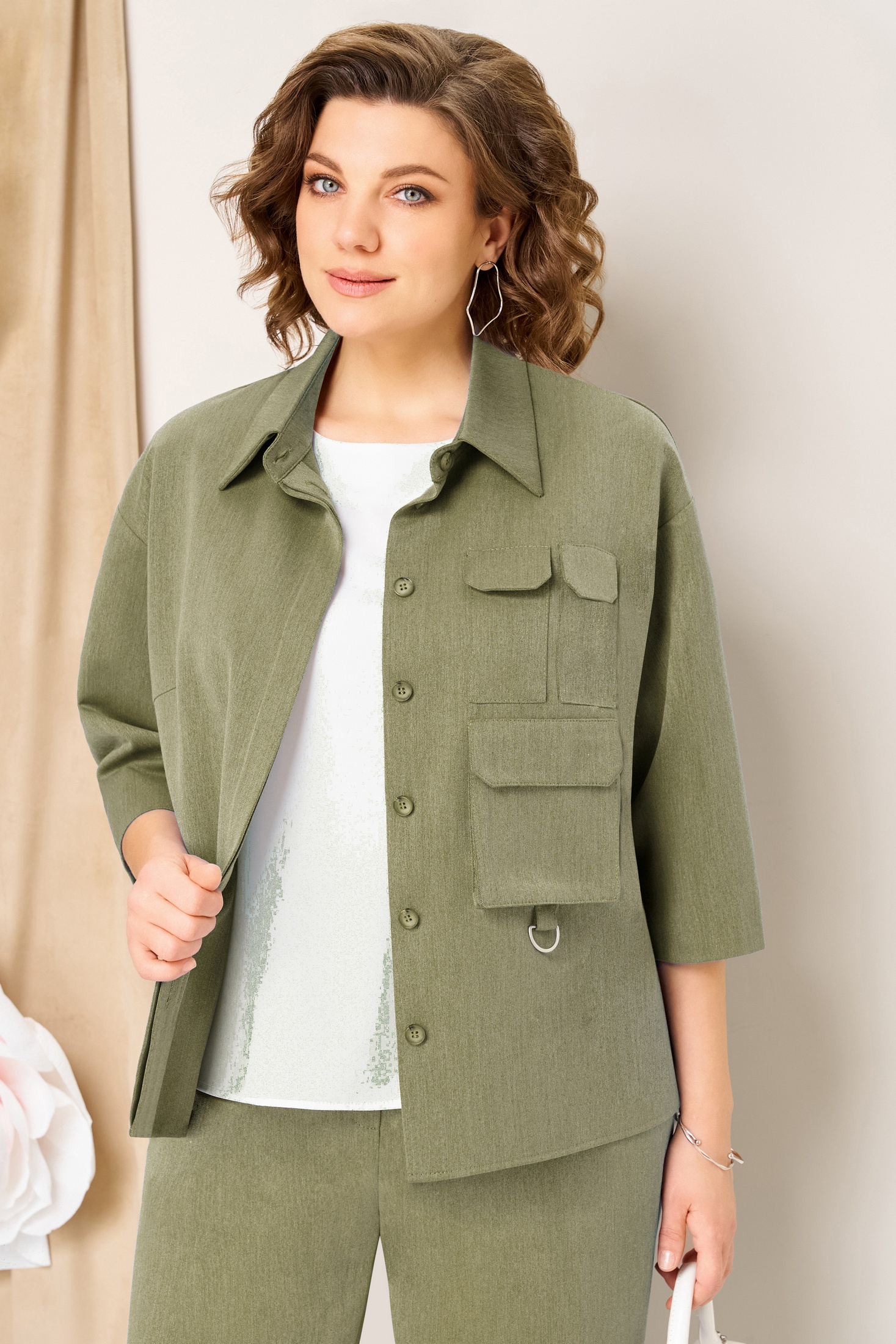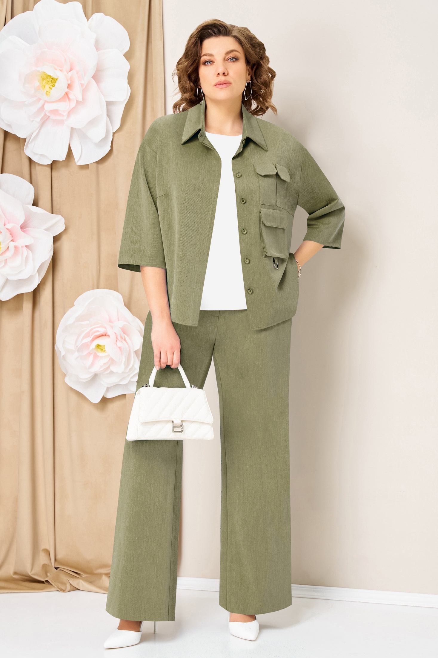 Костюм брючный 1463 олива VOLNA – это стильный комплект-тройка, который станет отличным вариантом для вашего гардероба. Коллекция бренда VOLNA создана для тех, кто ценит комфорт и стиль. Жакет-рубашка с потайной застежкой на пуговицы и карманами выполнен из сочетания полиэстера и вискозы, добавляющего мягкость и комфорт. Брюки свободного кроя с высокой посадкой и притачным поясом дополнены разрезами, идеально подходящими для создания повседневного образа. Легкая блуза со спущенным коротким рукавом – идеальное дополнение. Оливковый цвет костюма подчеркнет вашу индивидуальность, а его универсальный стиль подходит для межсезонья. Длина жакета по спинке составляет 61 см, а длина рукава – 45 см, что обеспечивает удобную посадку. Брюки по боковому шву имеют длину 105 см, а блуза по спинке – 59 см.