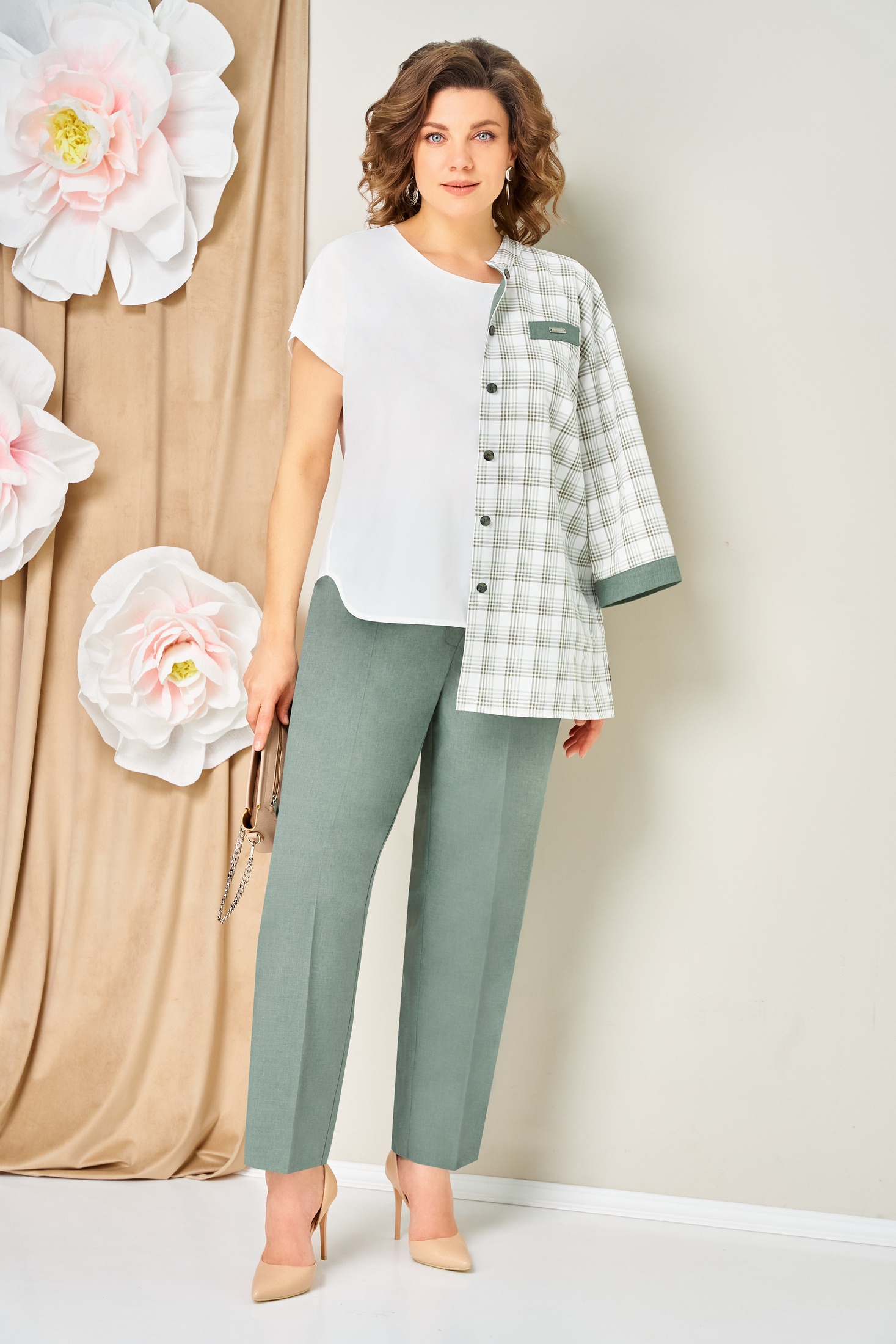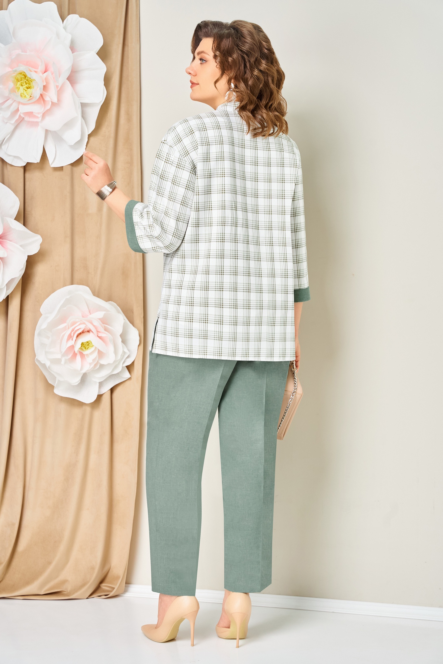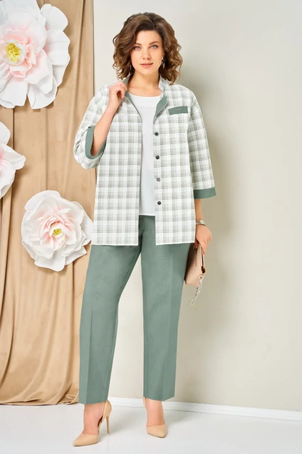 Костюм брючный 1465 светло-зеленый VOLNA — идеальный вариант для стильного и комфортного образа. Коллекция бренда VOLNA предлагает этот костюм, выполненный из полиэстера, вискозы и спандекса, обеспечивающего комфорт и свободу движений. Жакет с воротником-полустойкой, длиной по спинке 65 см, и спущенной линией плеча, украшен потайной застежкой. Брюки прямого кроя с высокой посадкой и эластичным поясом на резинке имеют длину 100 см, что идеально для любого повседневного образа. Блуза из легкого текстиля со спущенным коротким рукавом и длиной 59 см дополняет комплект. Светло-зеленый цвет и клетчатый рисунок придают изделию свежий и неординарный вид. Этот костюм — прекрасный выбор для делового, но расслабленного стиля в теплое время года.