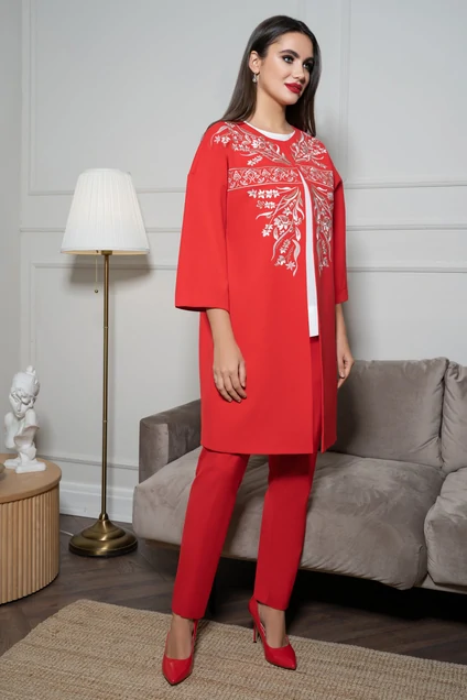 Костюм тройка, прекрасный выбор для вашего образа, который будет сочетать в себе красоту и удобство. Изящность линий создает привлекательный силуэт, а благодаря вышивке костюм становится более женственным и изысканным. Костюм женский состоит из удлиненного жакета с вышивкой по переду, брюк и блузы. Костюм для повседневной носки.