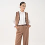 Левая часть горловины оформлена цельнокроеным воротником - стойкой, правая воротником-шаль, переходящим в стойку на спинке. Обтяжные пуговицы, правый воротник – шаль, деталь верхнего левого кармана выполнены из отделочной молочной ткани. Жакет с плечевыми накладками.