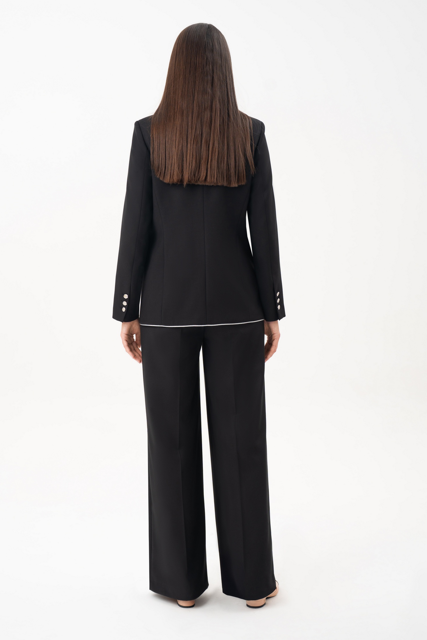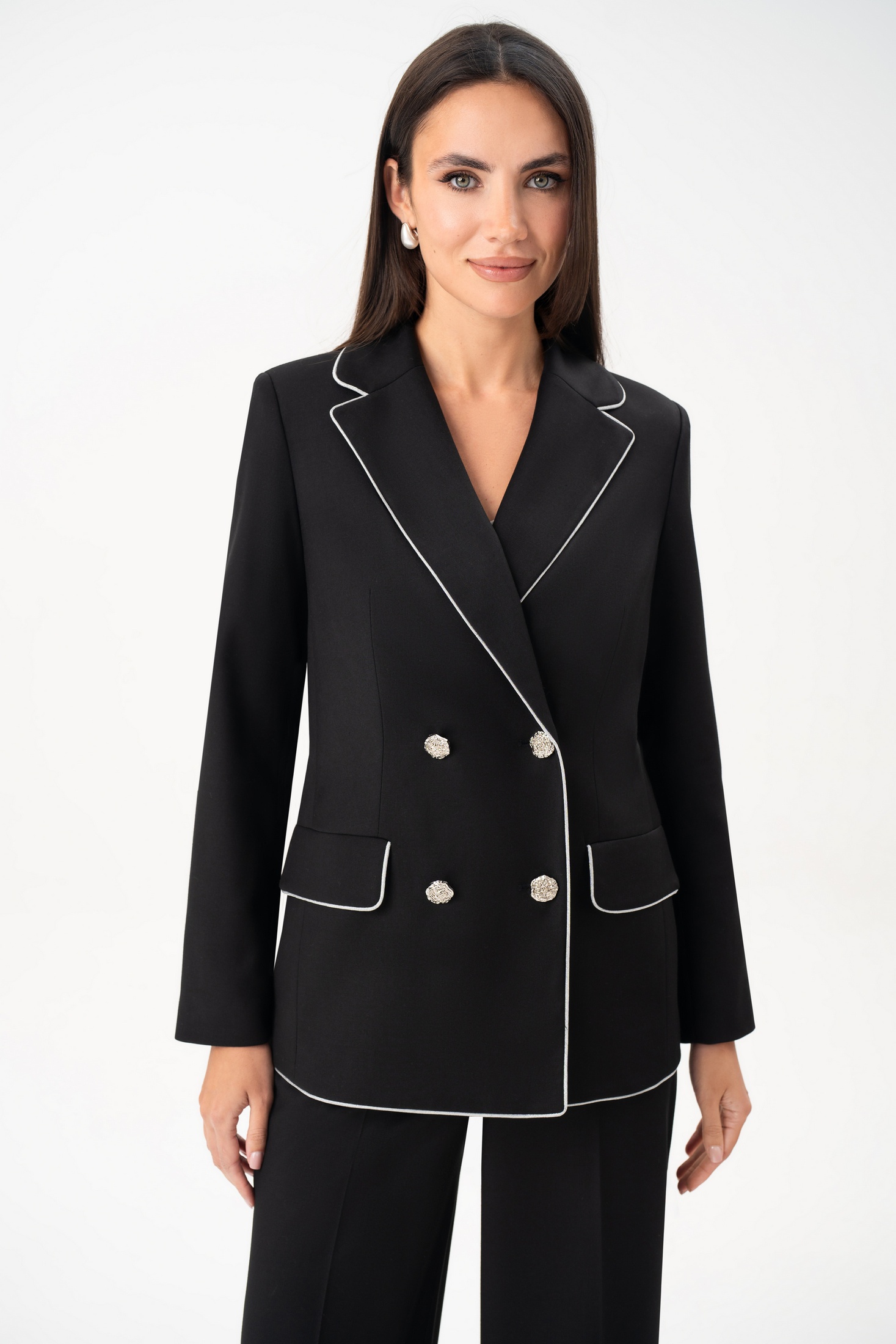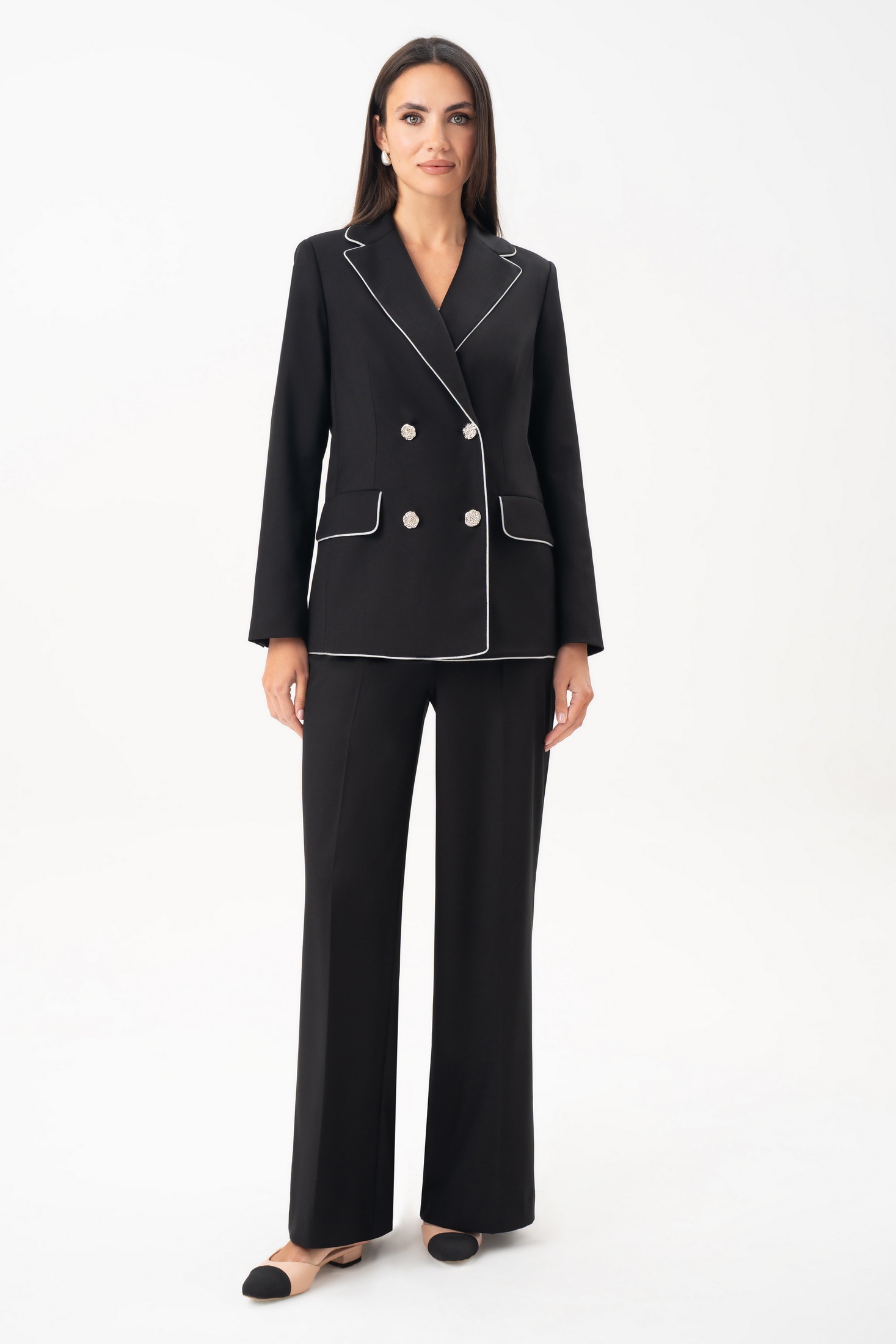 Женский брючный костюм URS — воплощение современного стиля, элегантности и уверенности. Этот черный костюм женский брючный создан для женщин, которые ценят безупречный внешний вид и классику в лучших традициях деловой моды. Элегантный жакет с серебристым кантом и аккуратными декоративными пуговицами придает образу изысканность и подчеркивает статус. Прямые брюки визуально вытягивают силуэт, создавая стройную и женственную линию. Костюм женский 2-х предметный, состоит из жакета и брюк, выполненных из костюмно-плательной ткани, для повседневной носки.