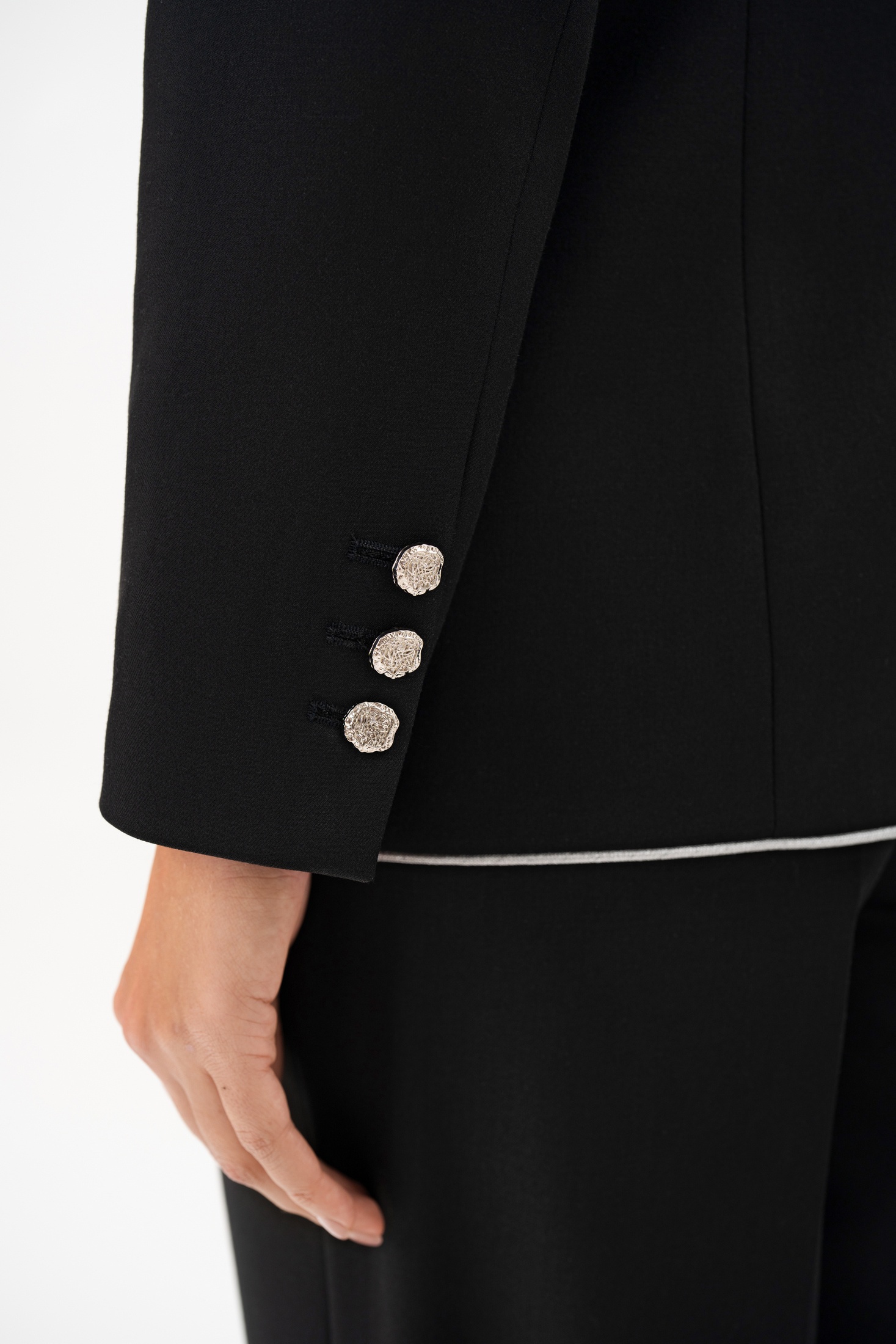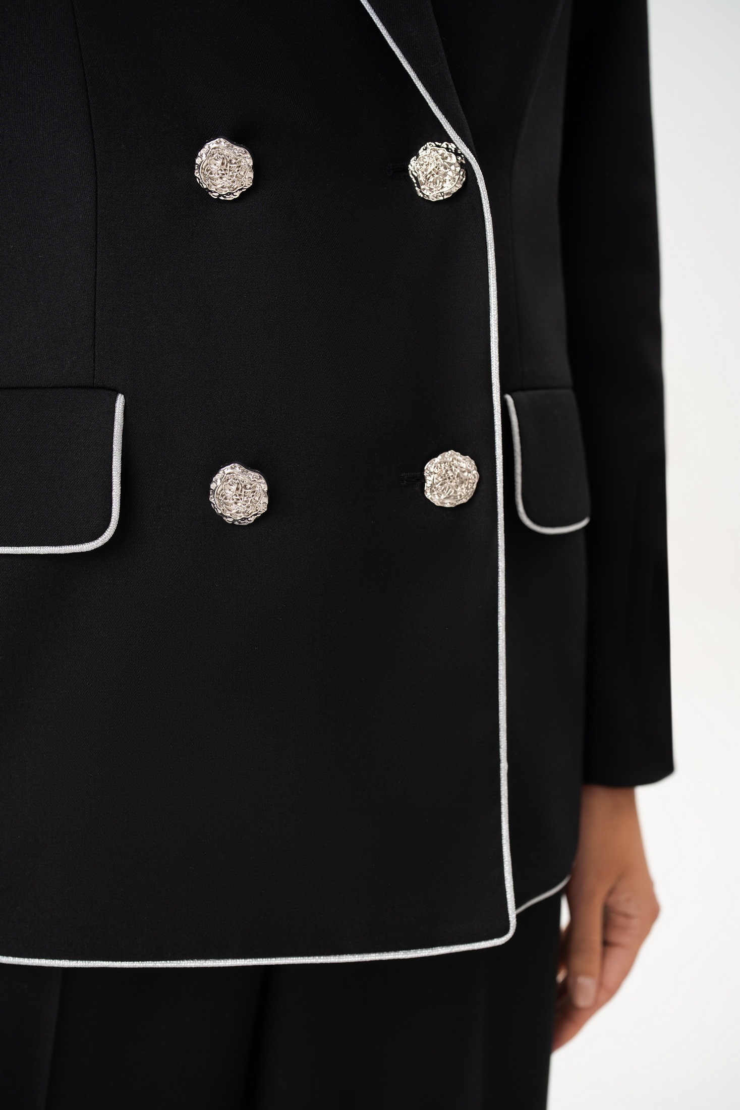 Воротник, лацканы, борта, низ переда и спинки обработан отделочным серебристым кантом. Жакет с плечевыми накладками.