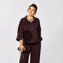 Стильный костюм выполнен из поливискозной костюмной ткани цвета горького шоколада и отстрочен контрастной отделочной строчкой. Свободный крой подарит уверенность и комфорт, а сбалансированные пропорции выгодно подчеркнут вашу фигуру. Жакет прямого силуэта, воротник рубашечный, рукав реглан, спинка со средним швом. Низ спинки фигурной формы, на полочках обработаны карманы с клапаном. В боковых швах жакета обработаны шлицы, которые декорированы пуговицами. Застежка центральная, на петли пуговицы. Брюки прямые, зауженные к низу за счет складок, которые отстрочены контрастной отделочной строчкой. Перед брюк с карманами. Застежка на тесьму-молнию, которая закрыта ассиметричной складкой с завязкой. Задние половинки брюк с накладными карманами. Пояс брюк цельнокроеный, сзади на резинке. Завязки декорированы металлическими наконечниками. Костюм декорирован нашивками, расположенными по низу брюк и низу рукава.