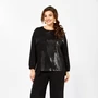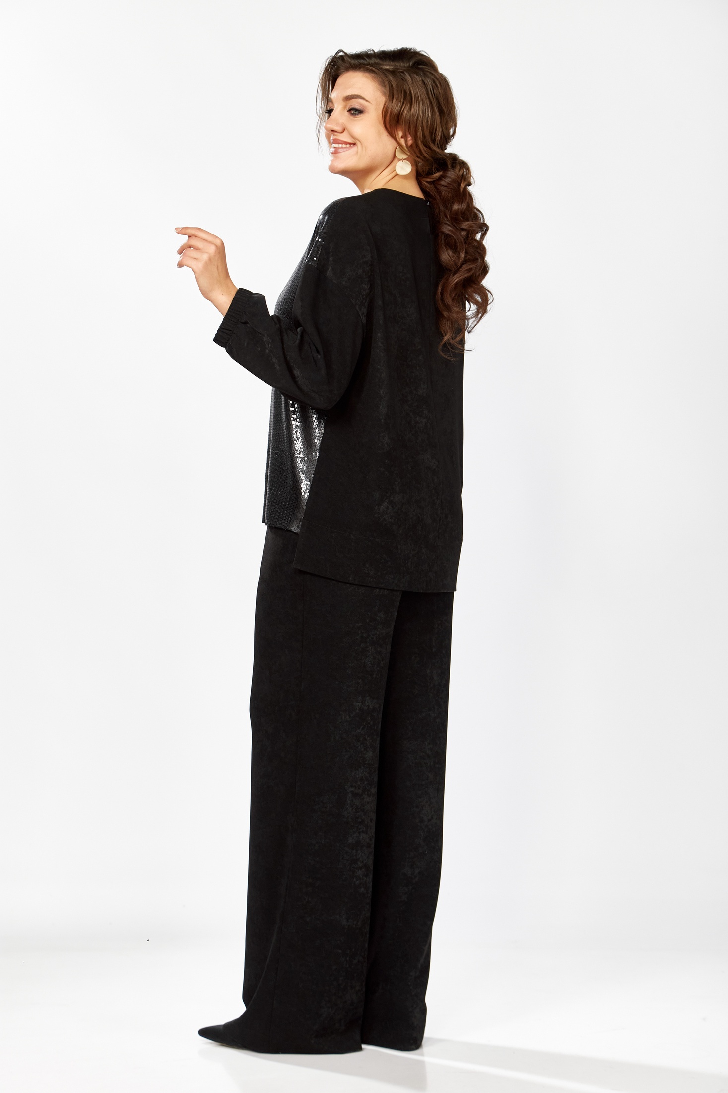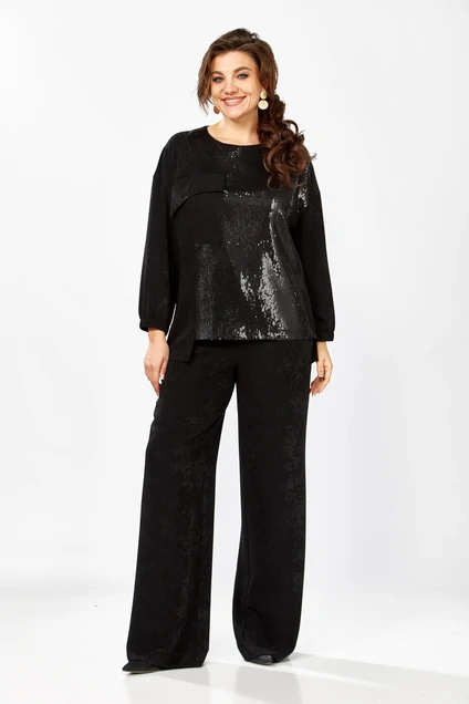 Нарядный костюм классически черного цвета из мягкой, бархатистой ткани с эффектной вставкой из пайеток. Блузон прямого силуэта со спущенной линией плеча и рукавом снизу на резинке. Одна сторона переда блузона с рельефом, на который настрочен накладной карман с клапаном. Вторая сторона с вытачкой, которая выходит из бокового шва. Вырез горловины округлой формы. Свободный крой брюк «палаццо» с высокой посадкой обеспечивает комфорт и свободу. Костюм идеален для торжеств и мероприятий. Длина блузона по среднему шву спинки 71см., длина рукава 43см., ширина плеча 23см,, длина брюк 113см. Декор может отличаться от представленного на фото