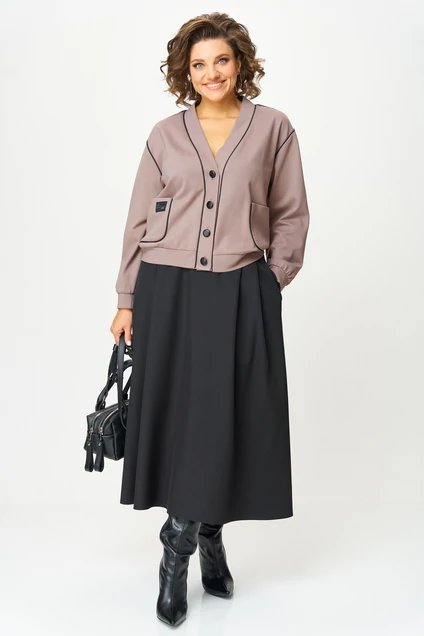 Этот комплект создан для женщины, которая любит элегантность в простых линиях и универсальность в каждой детали. Кардиган свободного кроя с глубоким V-образным вырезом и застежкой на крупные декоративные пуговицы. Контрастная отделка кантом по краям и по швам. Два накладные кармана спереди и контрастная нашивка на кармане для акцента придают образу лёгкости и расслабленности. Длинные рукава с эластичными манжетами обеспечивают удобную посадку Юбка миди мягко струится, создавая лёгкое движение при ходьбе и добавляя силуэту женственности. Складки в области талии формируют гармоничные пропорции, а глубокий чёрный цвет придаёт образу утончённости и делает его универсальным.