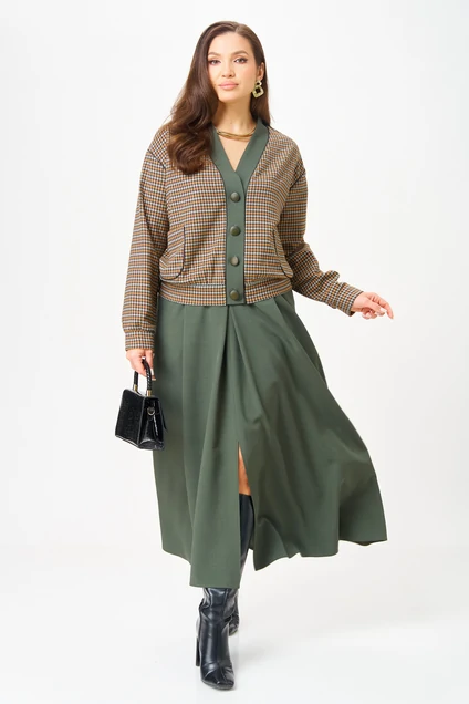 Этот костюм — воплощение интеллектуальной элегантности. Мягкий светло-серый кардиган с коричневыми кантами и крупными пуговицами создаёт образ уютного шарма. V-образный вырез визуально вытягивает шею, а контрастные детали подчёркивают чёткость линий. Рукав на спущенной плойме с манжетой по низу. По перду накладные карманы с декоративной нашивкой. Коричневая юбка миди с глубокими встречными складками и разрезом по переду добавляет образу женственности. В боковых швах карманы. Юбка на подкладке. Для максимально комфортной посадки по бокам пояса вставлена эластичная резинка. Сочетание мягкого верха и строгого низа создаёт баланс между комфортом и аккуратностью, делая комплект универсальным для офиса, повседневных выходов и стильных деловых встреч.