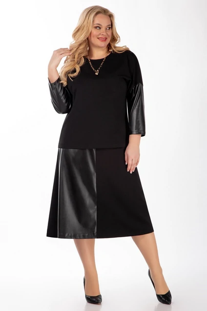 Костюм женский состоящий из юбки и туники. Юбка пояс по бокам на резинке и боковой молнией. Юбка четырех линка, один из передних клинов выполнен их ткани эко кожа. Туника со спущенным рукавом, выполенеа из двух видов ткани, эко кожа и трикотаж. Комплект можно носить как с поясом , так и без него. Длина туники 63 см, дина юбки 73 см.