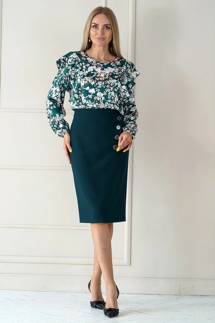 Блузка женская прямого силуэта, с разрезом ввиде капельки по спинке и застёжкой на навесную петлю и пуговицу. Перед и спинка с рельефными швами в шве соединения волан разной раной ширины. Рукава втачные, одношовные, длинные, понизу собранные на резинку. Юбка женская полуприлегающего силуэта, на подкладке, на притачном поясе, с застёжкой на тесьму-молнию в среднем шве заднего полотнища.