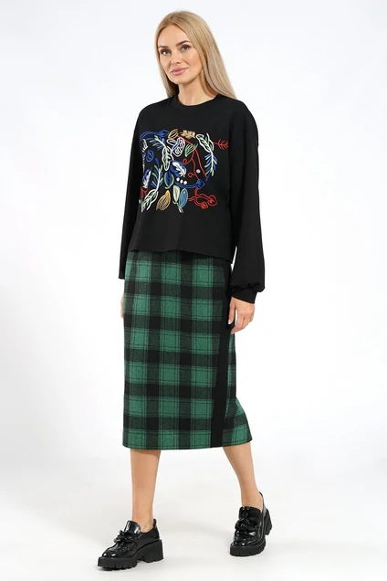 Комплект женский 2-х предметный состоящий из блузы и юбки. Блуза свободного силуэта, со спеченной линией плеча, декорирована по переду вышивкой. Рукава, одношовные, втачные, понизу со сборкой и притачными манжетами. По горловине втачная бейка. Юбка полуприлегающего силуэта книзу чуть заужена, на притачном поясе. Застёжка на тесьму-молнию по среднему шву спинки на потайную тесьму-молнию на петлю и пуговицу по поясу. Перед с боковыми частями выполнены из основной ткани (однотон) и талевыми выточками. Спинка со средним швом заканчивающаяся шлицей и талевыми вытачками. трикотажное полотно