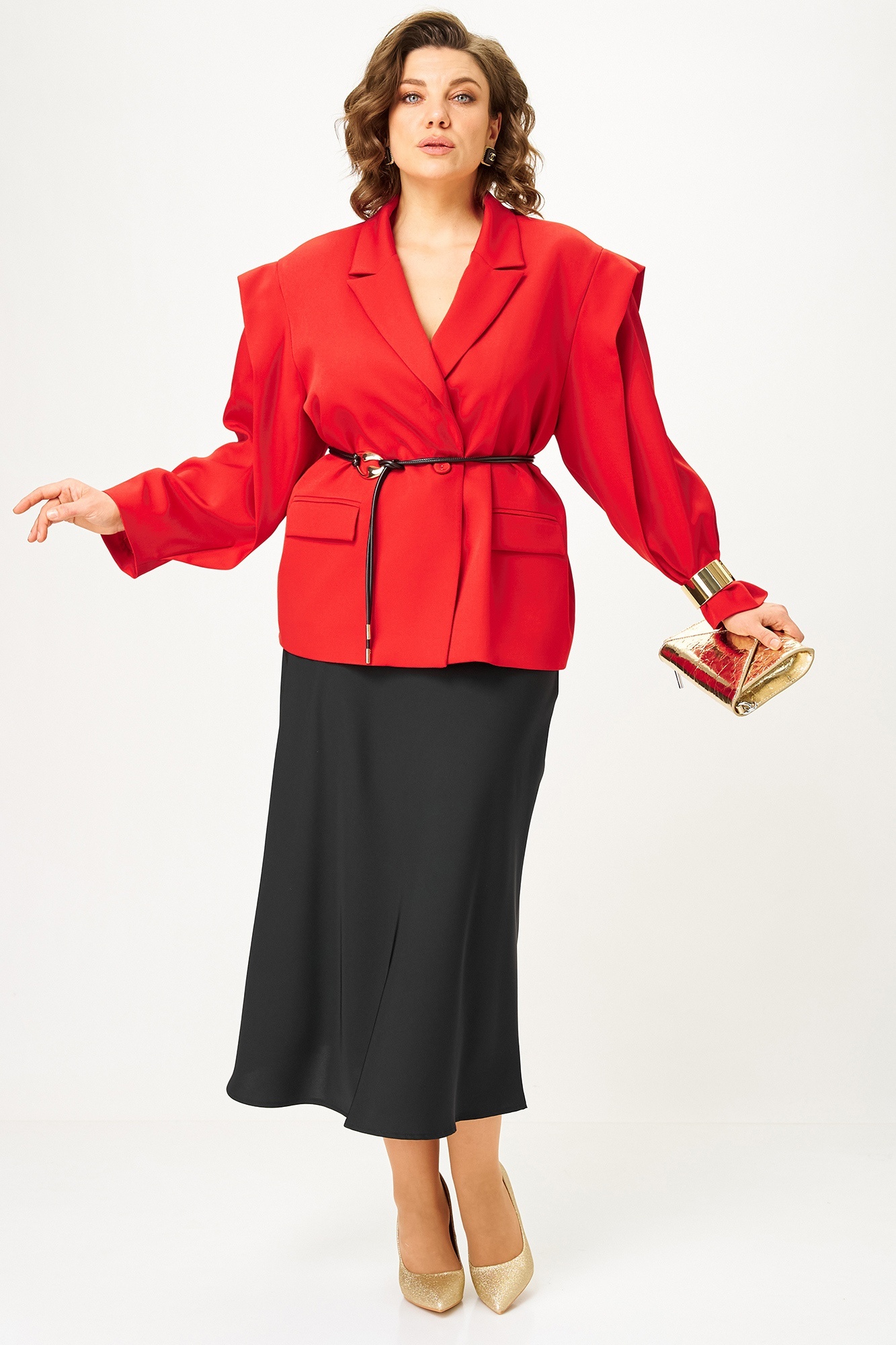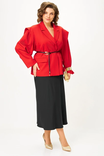 Костюм с юбкой 2509 красный + черный ALANI из коллекции бренда ALANI представлен в ярких красно-черных цветах. Комплект состоит из оверсайз жакета с ремнём и юбки. Жакет выполнен из полиэстера с добавлением эластана для комфорта и удобства, имеет свободный силуэт и отложные лацканы. Длина по спинке украшена асимметричными складками. Юбка полуприлегающего силуэта типа «рыбки» в черном цвете, обеспечивает элегантное облегание, подчёркнутое косым кроем. Подходит для офисного и повседневного стиля, идеальна для осенне-зимнего сезона. Застёжки на пуговицу и потайную молнию дополняют образ функциональностью и практичностью.