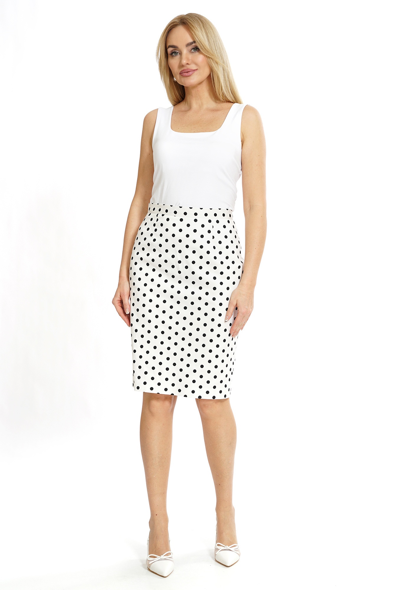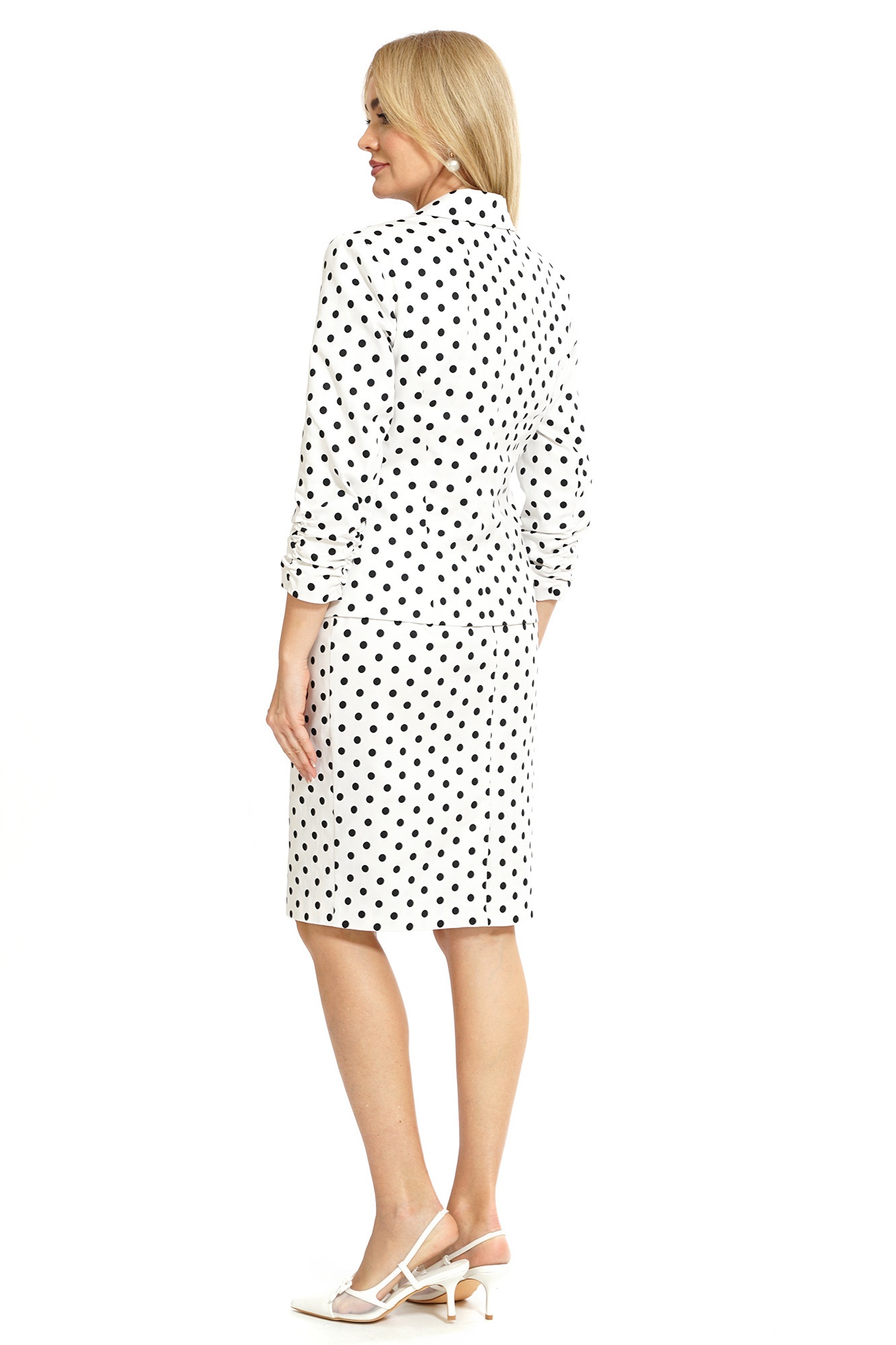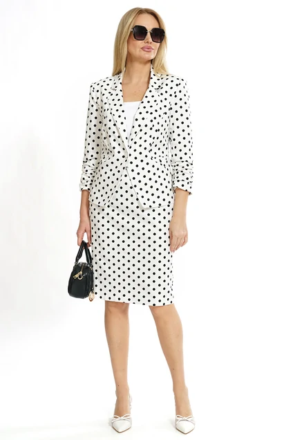 Костюм с юбкой 2533 ALANI идеально сочетает элегантность и современность. Коллекция бренда ALANI предлагает жакет полуприлегающего силуэта с отложным воротником, подкладкой и застёжкой на пуговицу. Прорезные карманы и отделочный кант подчёркивают внимание к деталям. Полуприлегающая юбка на подкладке с потайной молнией добавляет удобства и стиля. Материал костюма сочетает 97% хлопка и 3% спандекса, что обеспечивает комфортное прилегание. Ткань топа выполнена из вискозы и нейлона, придавая лёгкость и изящество. Стильный чёрно-белый горошек делает костюм идеальным для офисного и повседневного образа в любое время года.
