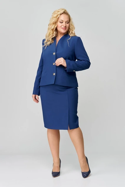 Костюм женский, состоящий из жакета и юбки. Жакет на подкладке полуприлегающего силуэта с центральной застежкой на 3 петли и пуговицы и аккуратным цельнокроенным воротником "стойка". Перед с отрезными бочками и наклонными карманами с листочками , спинка со средним швом и отрезными бочками. Рукава втачные двухшовные со шлицами по низу. Юбка на подкладке прямая, слегка зауженная книзу, со шлицей спереди, на притачном поясе с резинками в области боковых швов и застежкой сзади на пуговицу и тесьму "молния"
