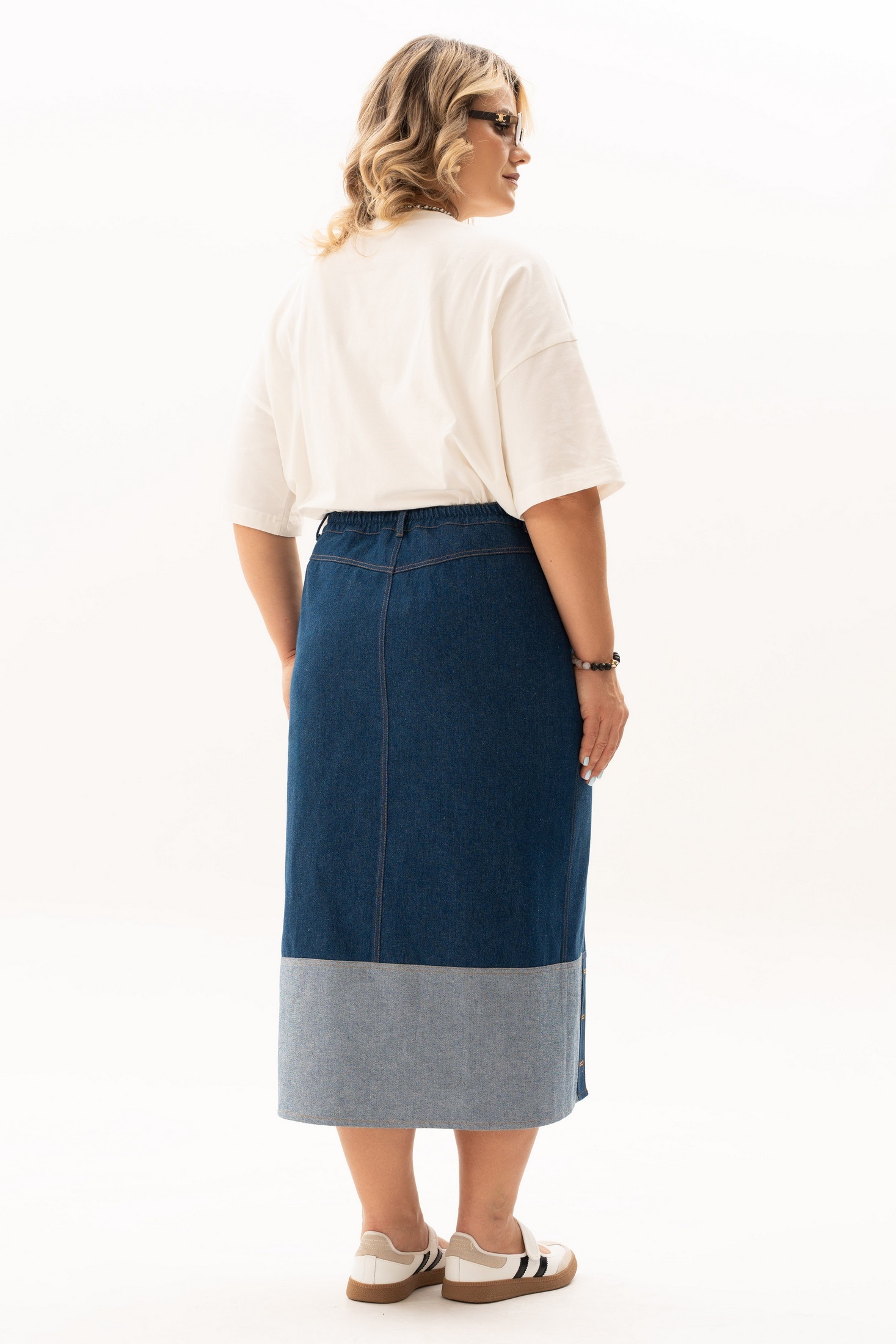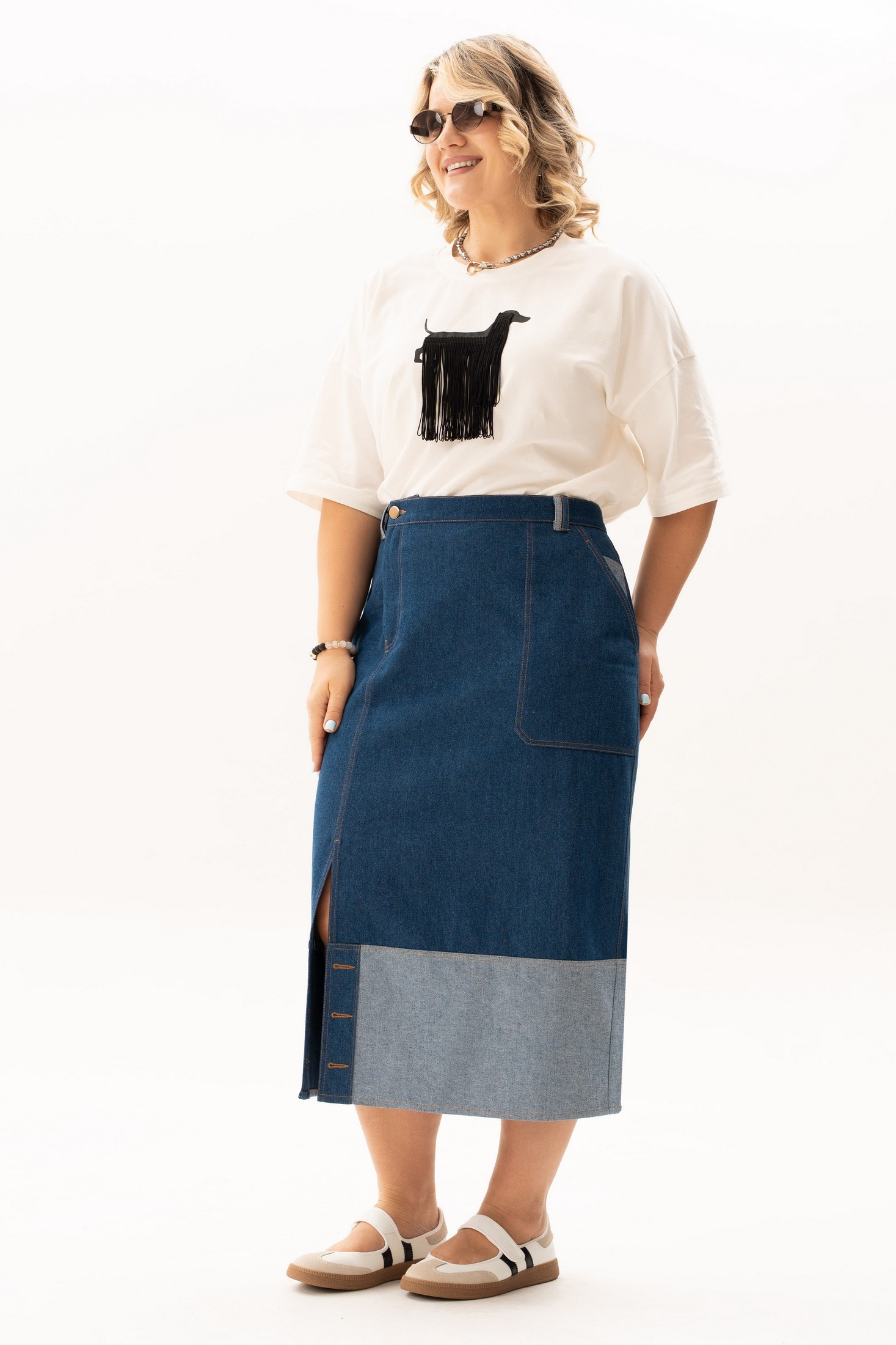 Костюм с юбкой 4148 Algranda (Новелла Шарм) — идеальный выбор для стильного летнего гардероба. Коллекция бренда Новелла Шарм предлагает комплект из блузки и джинсовой юбки, который сочетает в себе комфорт и стиль. Блузка из хлопка и эластана, длиной 64 см, обеспечивает легкость и воздухопроницаемость, делая её отличным решением для жарких дней. Принт в виде собаки на блузке добавляет нотку креативности. Джинсовая юбка длиной 89 см с контрастным подолом, функциональными карманами и оригинальной асимметричной застёжкой является универсальной базой для различных образов. Цветовая гамма и детали дизайна делают костюм идеальным для прогулок, работы или вечернего выхода.