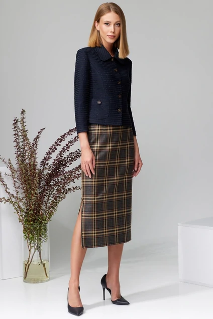 Костюм состоит из жакета и юбки. Жакет полуприлегающего силуэта с центральной застежкой на 5 петель и пуговиц и воротником со стойкой. Перед с рельефом и накладным карманом. На кармане пуговица. Спинка со средним швом и рельефами. Рукав втачной двухшовный. Жакет на подкладке. Юбка прямая с молнией по всему боковому шву. Передняя и задняя части с талиевыми вытачками. Юбка на подкладке. Длина жакета - 49 см, длина рукава - 50 см, длина юбки - 80 см. Юбка: ПЭ- 74%, вискоза -23%, спандекс- 3%.