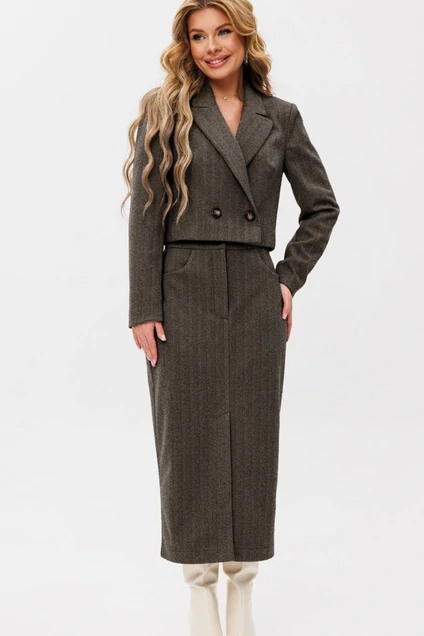 Двухпредметный костюм в деловом стиле, который включает в себя укороченный жакет и миди-юбку. Жакет выполнен в полуприлегающем силуэте с элегантными нагрудными вытачками и двухбортной застежкой на петли-пуговицы, полностью на подкладке для комфорта. Цвет жакета и юбки — меланжевый серый, что добавляет наряду утонченности. Юбка прямого силуэта дополнена притачным поясом, застежкой на пуговицу и молнию спереди, а также функциональными карманами по бокам и небольшой шлицей для удобства движения. Этот костюм идеально подходит для создания респектабельного образа в офис или на деловые встречи.