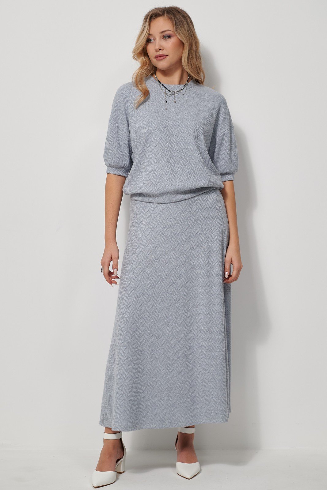 Костюм состоящий из джемпера и юбки, выполнен из мягчайшего трикотажа с добавлением вискозы идеальный для любого случая. Джемпер полуприлегающего силуэта, горловина обработана широкой бейкой. Линия плеча спущена, рукав втачной, одношовный, длинной до локтя по низу притачная манжета. По низу джемпера притачной пояс который обеспечивает идеальную посадку. Юбка А-силуэта длинной макси идеально подчеркнет все достоинства фигуры и скроет все недостатки. Благодаря притачному поясу на резинке юбка будет сидеть комфортно на любой талии. Наш костюм будет идеален для весенних дней и летних вечеров.