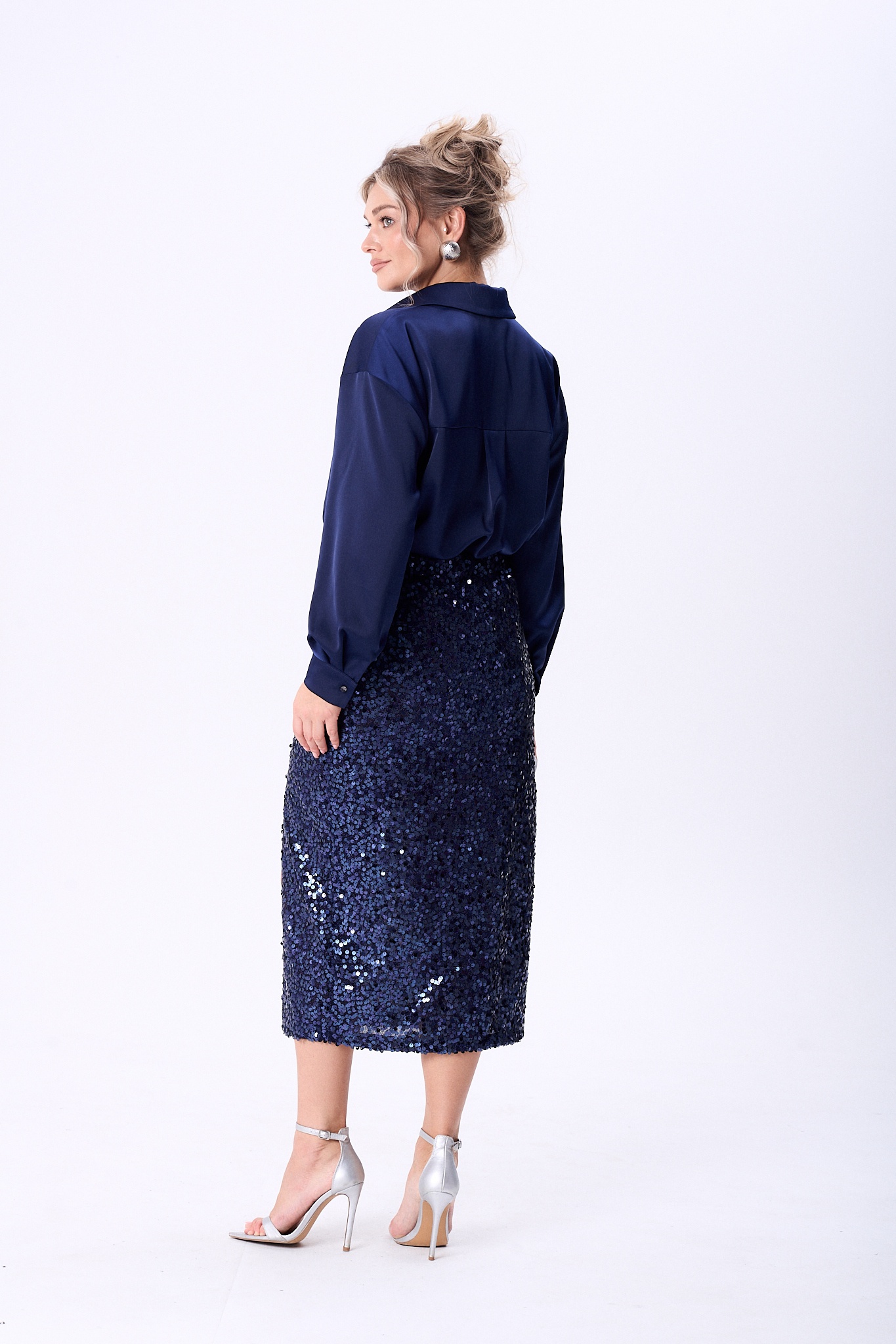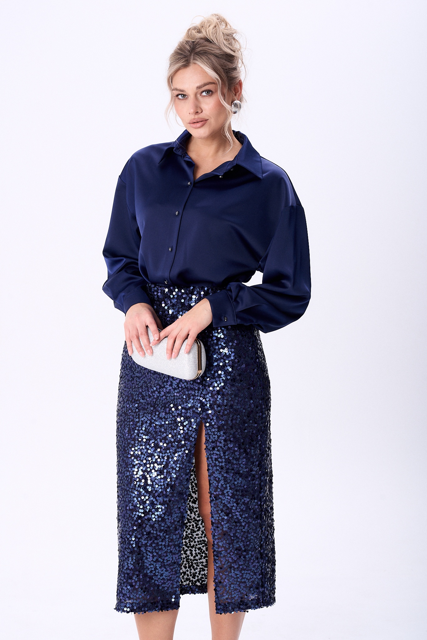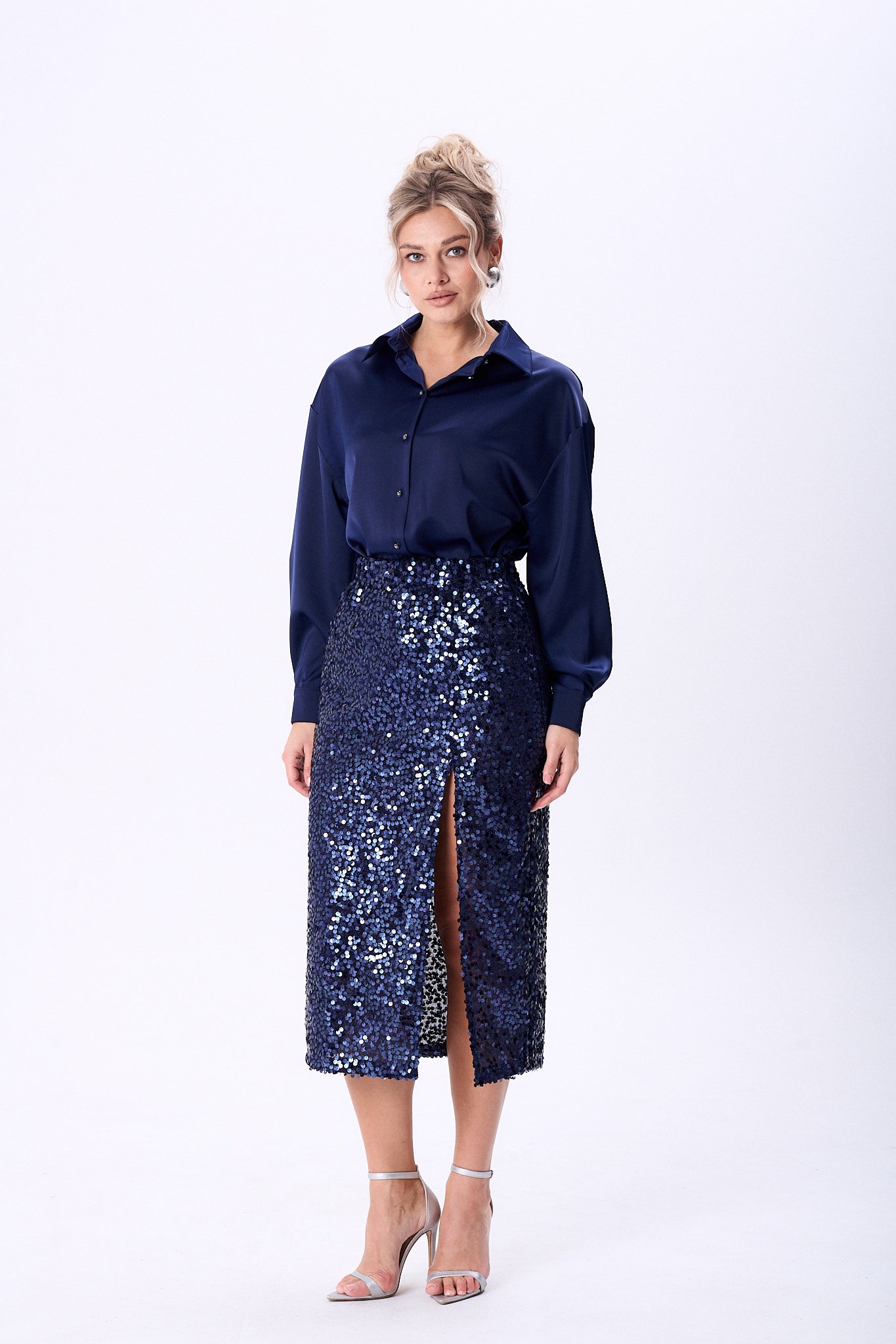 Костюм женский состоящий из юбки из сверкающей ткани в пайетки бронзового цвета и блузки из сатина. Юбка прямого силуэта на подкладке длинной миди, на переднем полотнище обработан разрез. Верхний срез юбки обработан эластичной тесьмой что обеспечит комфортную посадку изделия.