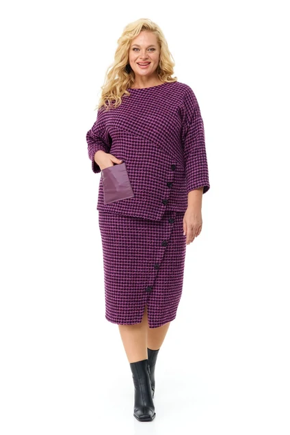 Комплект женский 2-х предмеиный ( блузка, юбка) из текстилькой ткани. Блуза прямого силуэта со спущенным плечом, низ по полочке фигурный, симметричный. По полочке идет кокетка в виде подреза, отделка в виде пуговиц и накладной карман (из эко-кожи). По спинке средний шов, рукав 3/4 длины. Юбка зауженная к низу, по полочке идет ассемитричный подрез с пуговицами. По спинке средний шов, шлица , пояс отрезной с резинкой. Длина блузы (по спинке):(50-54)- 59см, (56-60)-62 см. Длина рукава: (50-60)-33см. Длина юбки: (50-60):-73см.