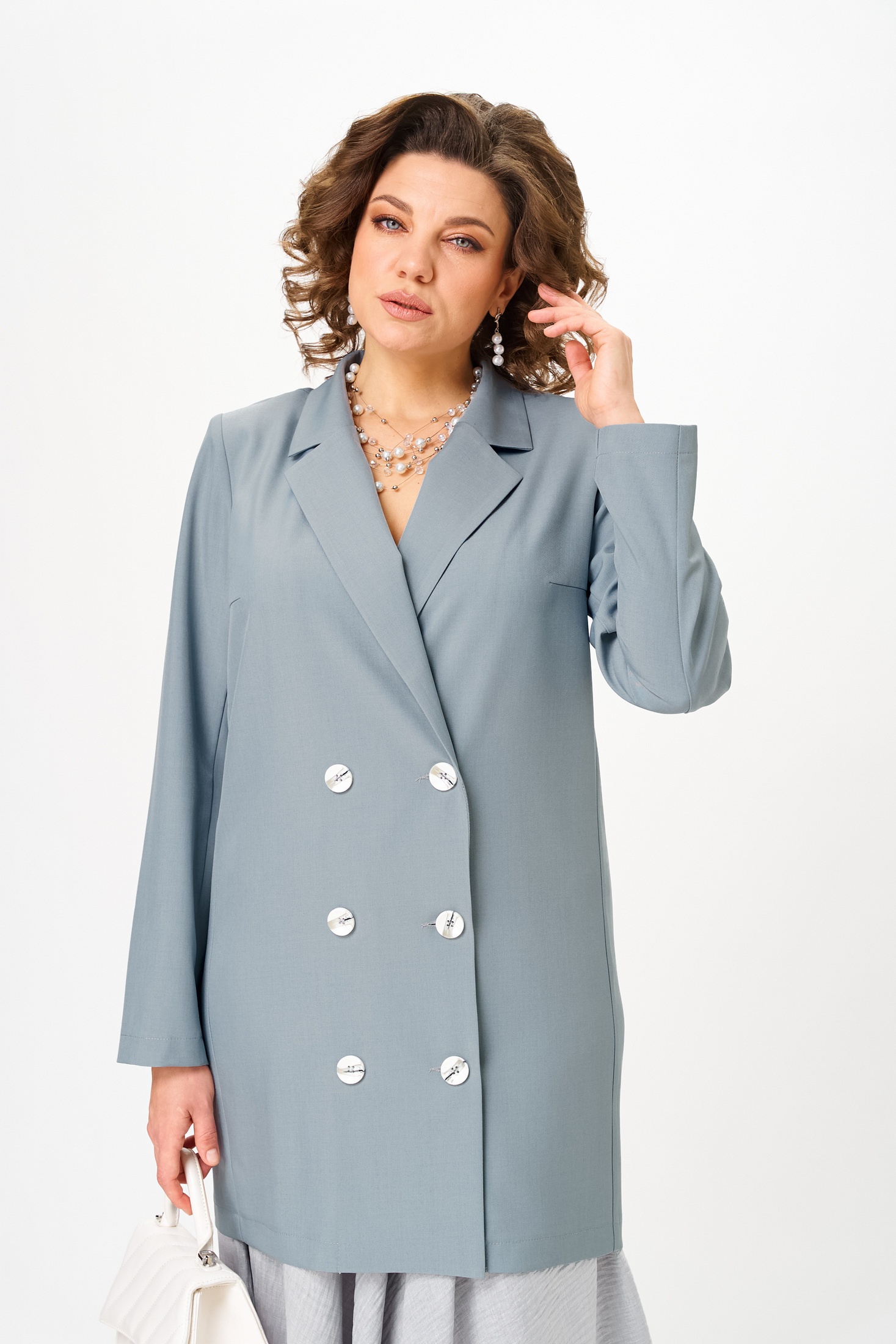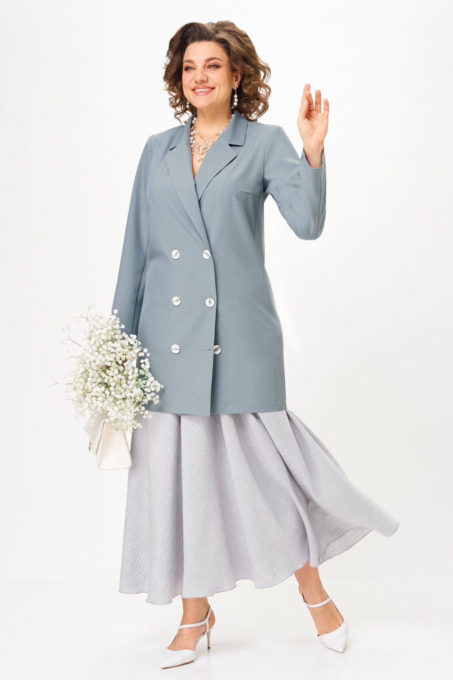 Костюм с юбкой 1262-3 французский серый Anastasia представлен в коллекции бренда Anastasia. Он выполнен в классическом стиле и изготовлен из премиальных материалов, включая полиэстер и вискозу, что обеспечивает комфорт и стиль. Комплект состоит из удлиненного пиджака и макси-юбки с резинкой на поясе. Двубортный пиджак с пуговицами и полуприлегающим силуэтом дополнен комфортным кроем и вточным рукавом длиной до 63 см. Юбка-солнце длиной 98 см добавляет элегантности и подходит для офисных или вечерних выходов. Серый цвет костюма дает возможность комбинировать его с различными топами для создания уникальных образов. Благодаря длине, пиджак можно носить как платье. Длина по спинке достигает 86 см, что подчеркивает изящность фигуры.