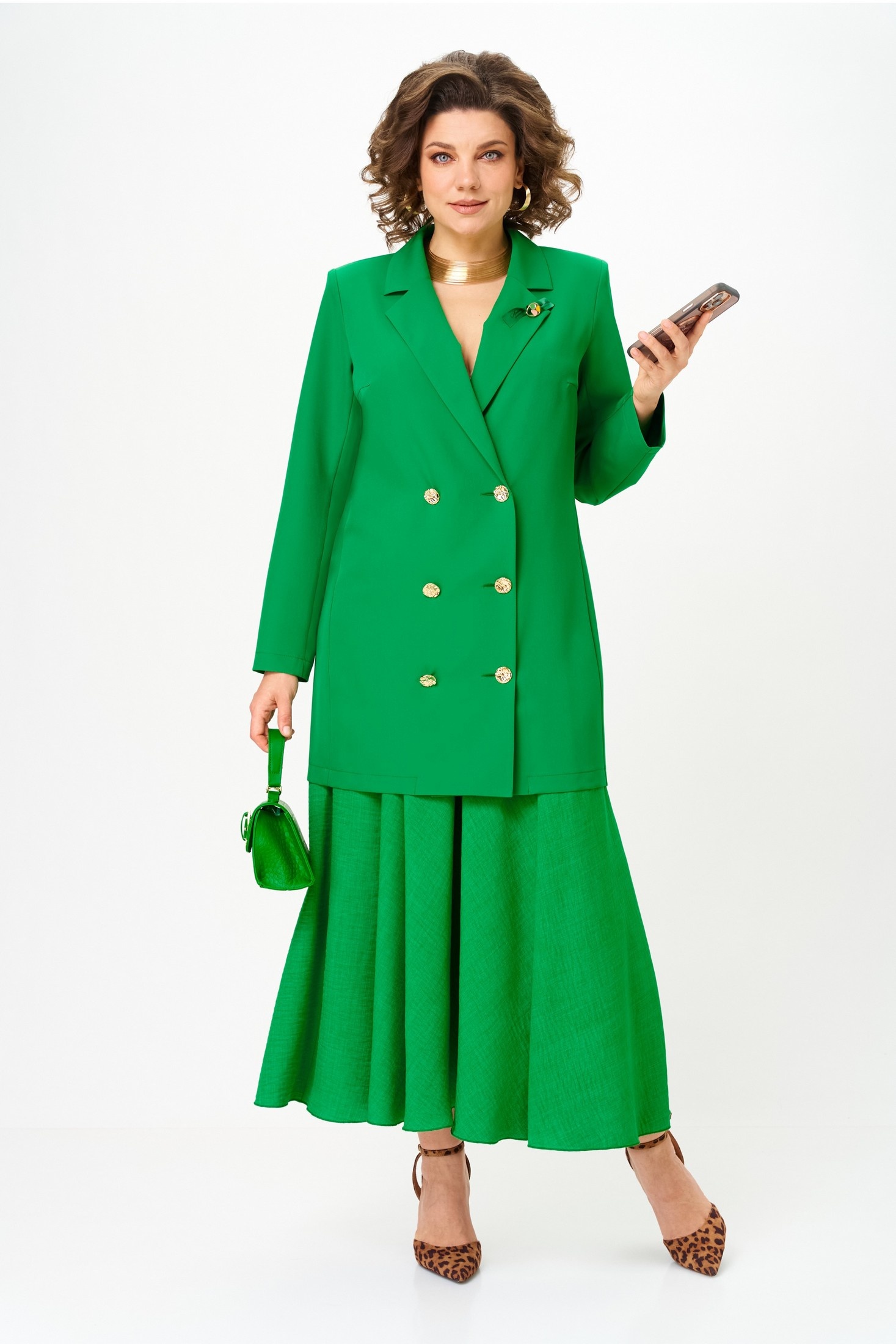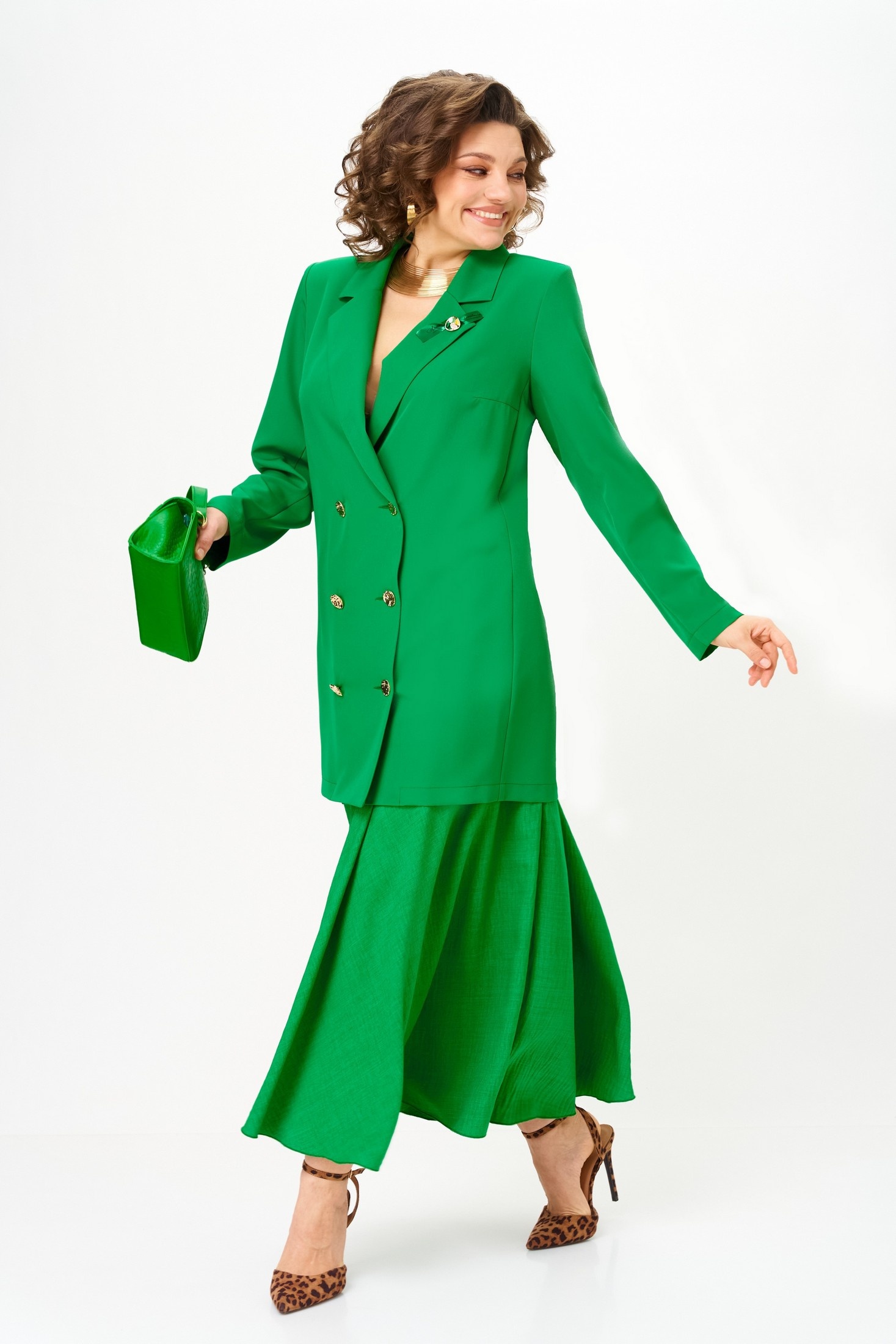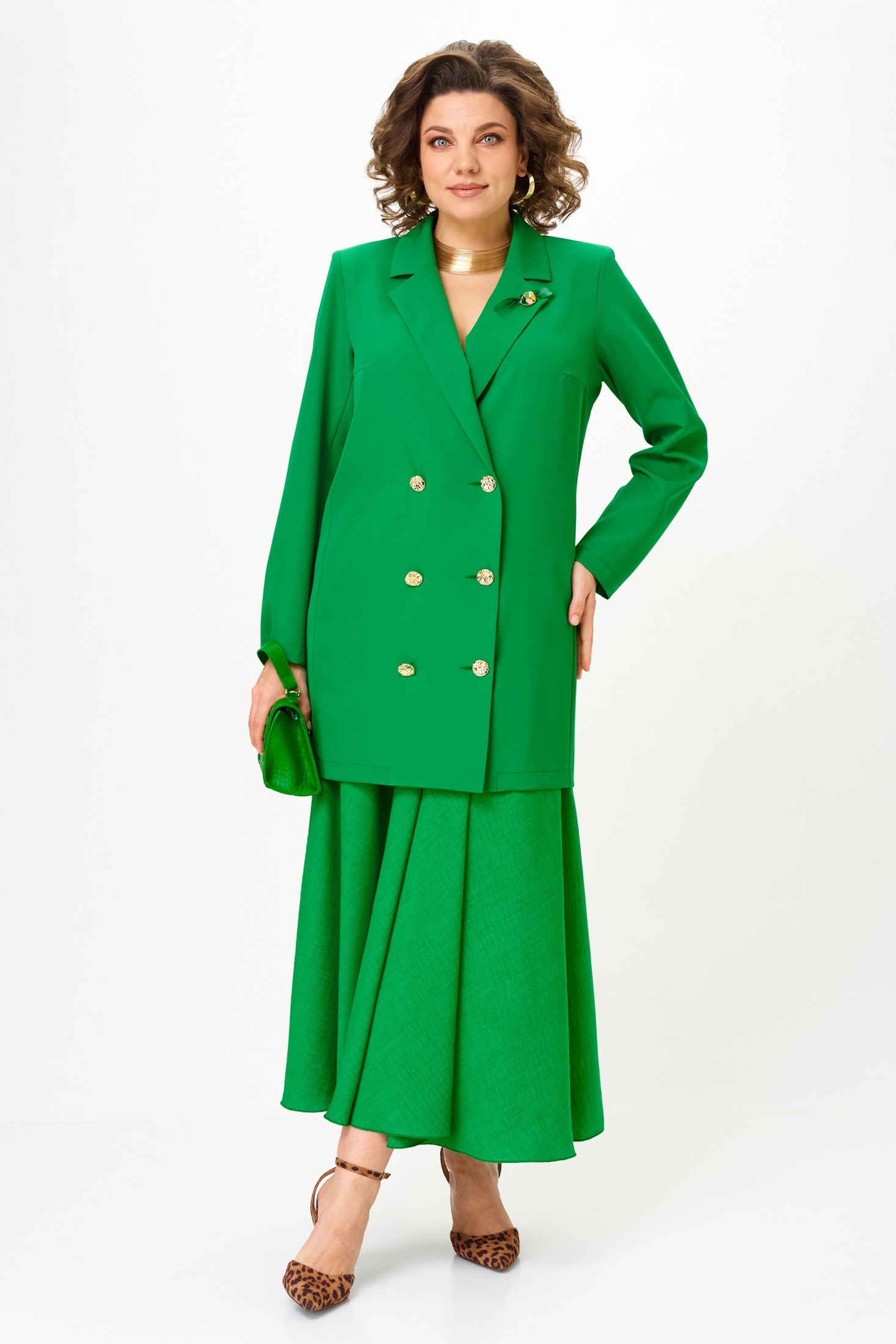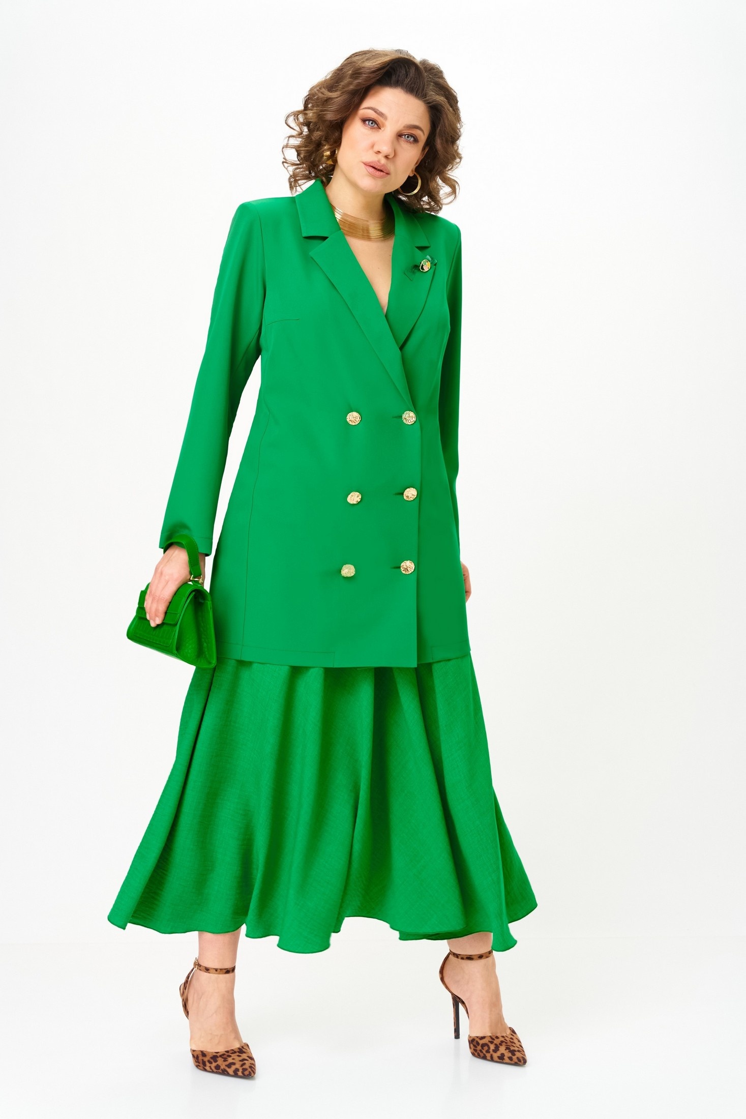 Костюм с юбкой 1262-3 весенний зеленый Anastasia станет вашей визитной карточкой в мире моды. Коллекция бренда Anastasia предлагает двойку, состоящую из удлиненного пиджака и макси юбки. Премиальная ткань с содержанием полиэстера и вискозы добавляет прочность и легкость образу. Двубортная застежка и пуговицы добавляют оригинальности. Полуприлегающий пиджак удобно носить как самостоятельное платье, подчеркивая достоинства фигуры. Макси юбка с резинкой на поясе обеспечивает идеальную посадку, а яркий зеленый цвет подчеркивает стильный внешний вид. Идеально подходит для весенних прогулок и деловых встреч, этот костюм легко адаптируется под различные события в вашем расписании.