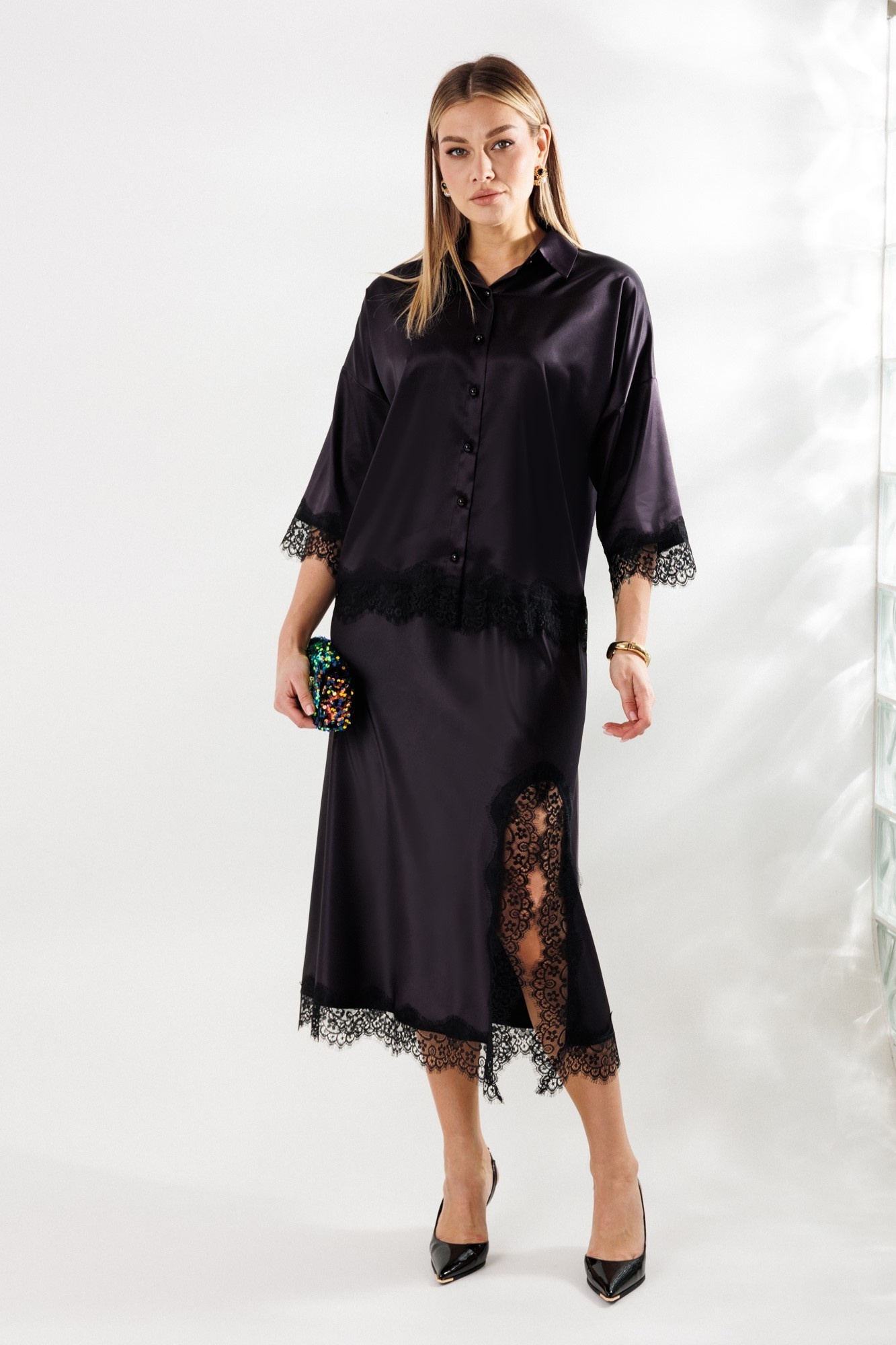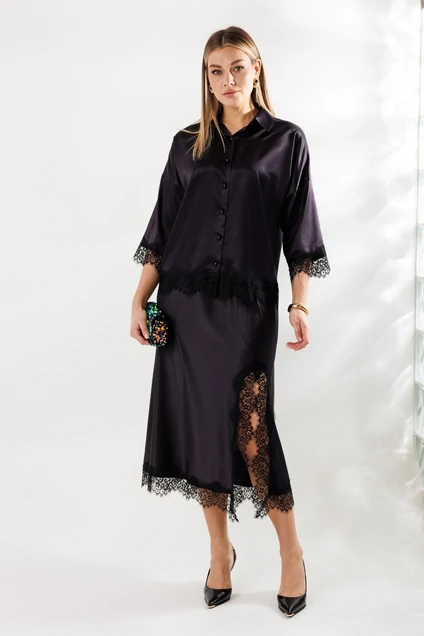 Костюм с юбкой 1331 Anastasia от бренда Anastasia воплощает изящество и женственность. Коллекция бренда выполнена из атласной ткани с изысканным ажурным кружевом, что добавляет романтичности и подчеркнутой утонченности. Блузка прямого силуэта со спущенным плечом и застежкой на планку, с воротником на отрезной стойке и рукавами длиной 3/4, создаёт стильный и современный образ. Юбка миди с косым разрезом выполнена из мягкого атласа, края которой обрамлены кружевом, добавляющим изюминку наряду. Резинка на поясе обеспечивает комфортную посадку. Длина блузки с кружевом (50-54)- 59см, (56-60)- 62см . Длина рукава с кружевом (50-60)- 29см. Длина юбки с кружевом (50-60)- 90 см. Подходит для повседневного и праздничного образов благодаря универсальности и стильному дизайну.