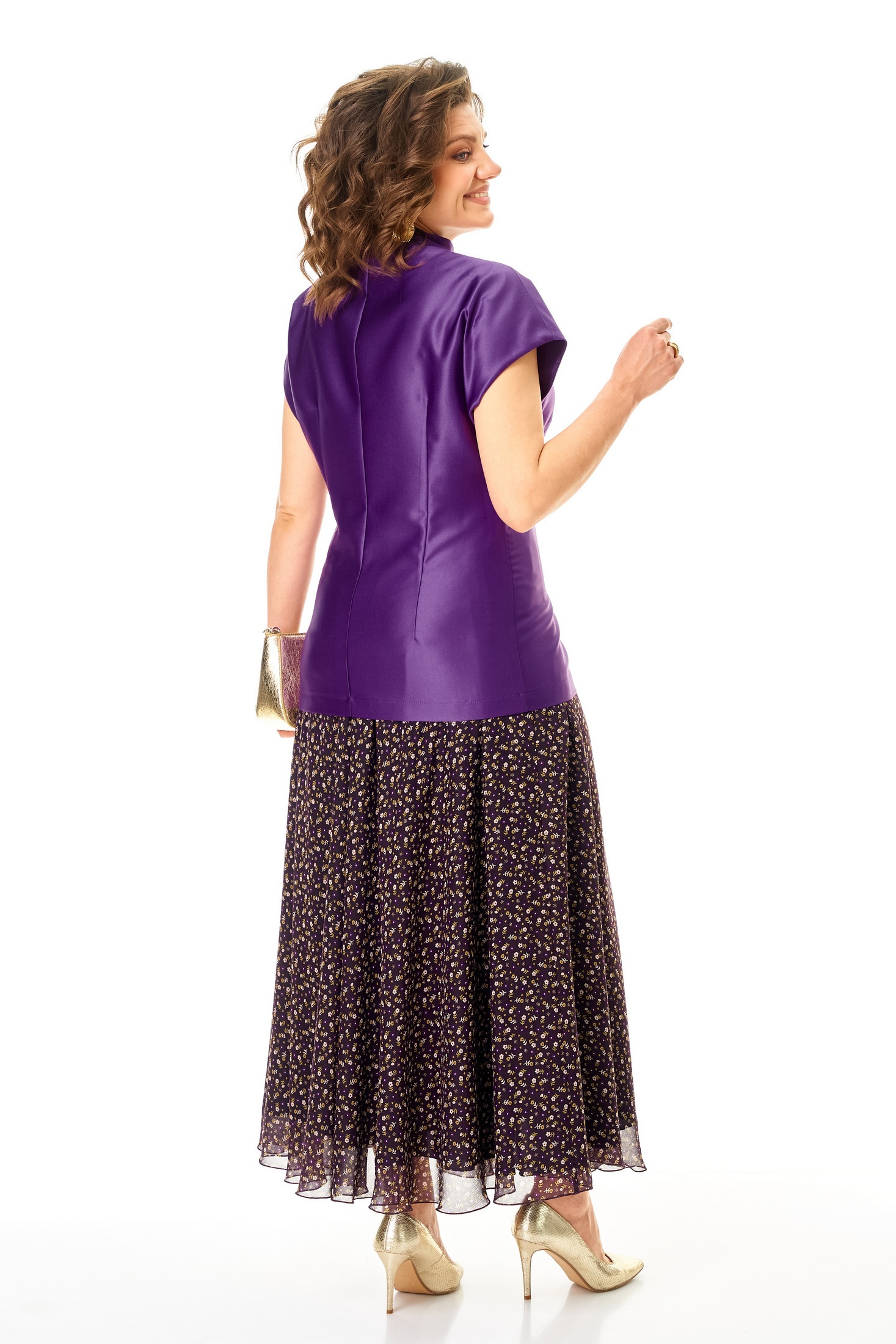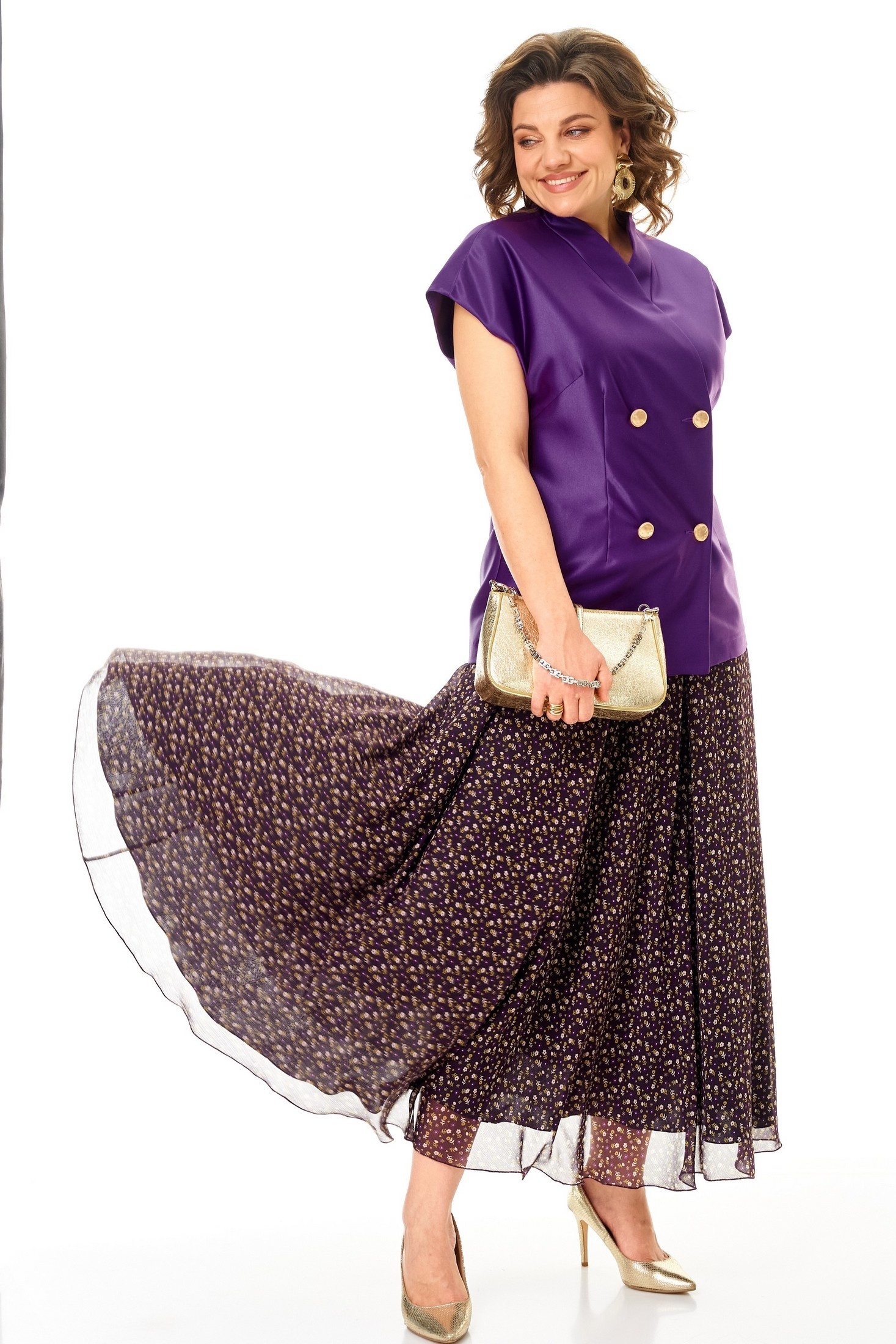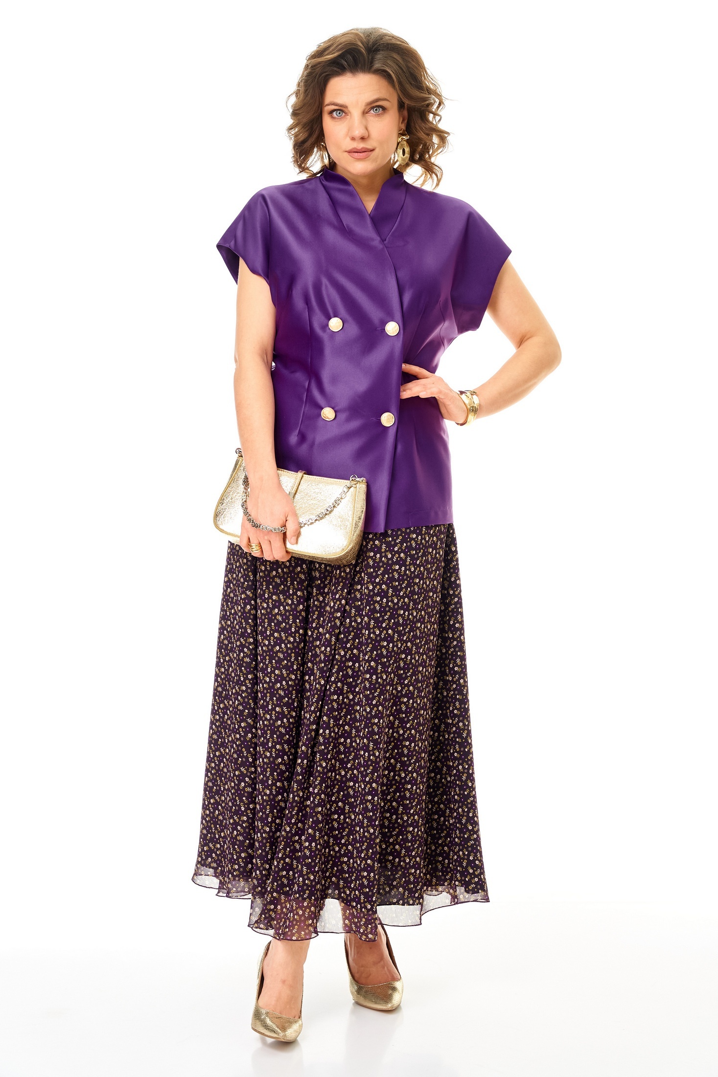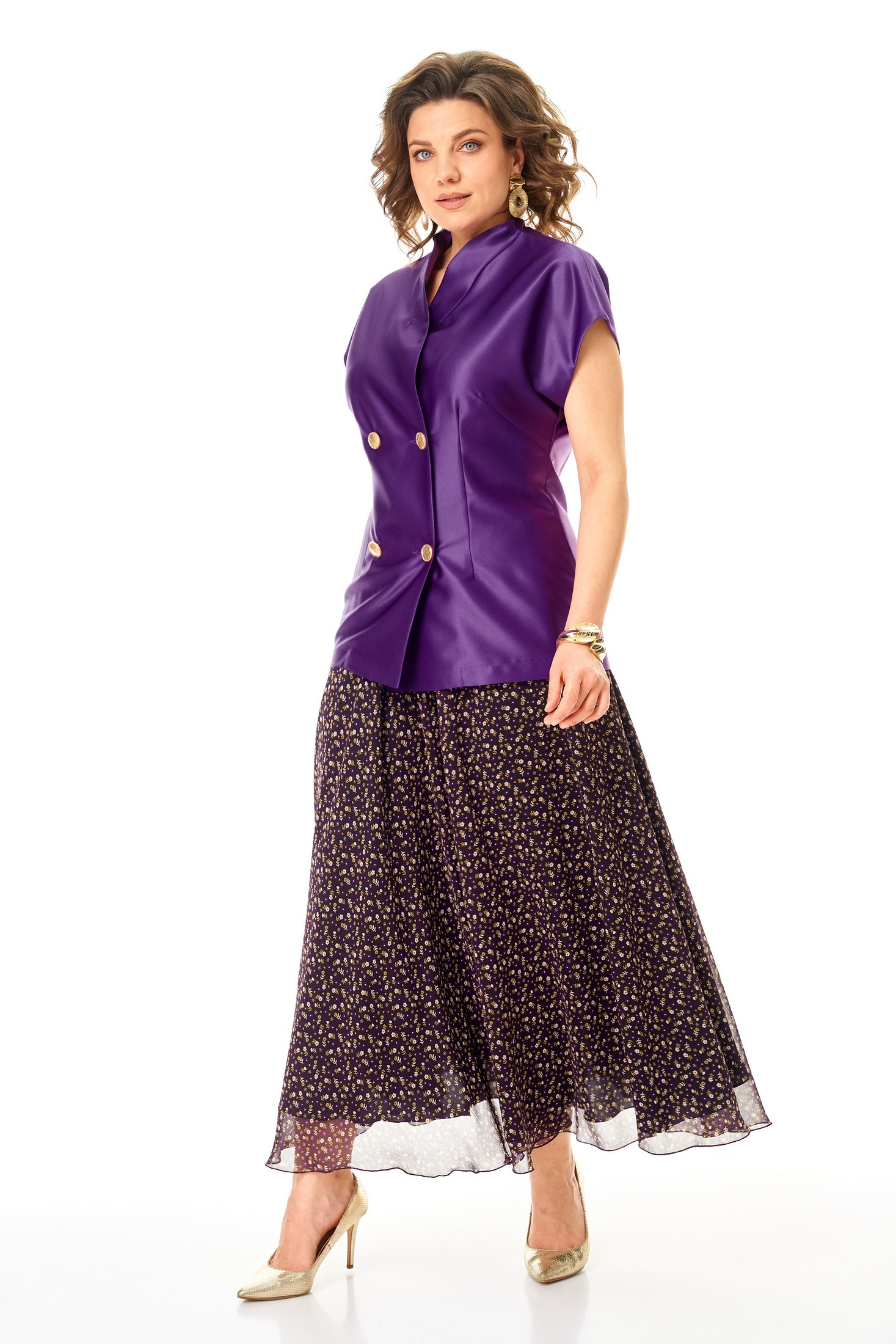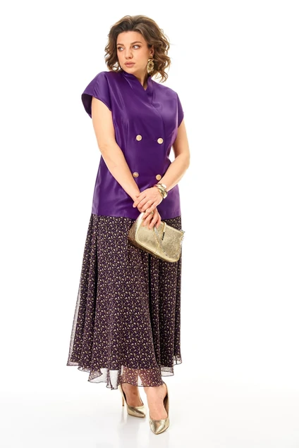 Костюм с юбкой 1347-2 фиолетовый Anastasia — это стильный выбор для повседневной носки. Коллекция бренда Anastasia сочетает в себе женственность и функциональность. Жилет из полиэстера с добавлением вискозы, полуприлегающего силуэта, со спущенным плечом, оснащен двухбортной застежкой и воротником-стойкой. Он может служить самостоятельным элементом гардероба. Юбка-макси из креш-шифона с декоративной резинкой и подкладкой подчеркивает женственные формы. Длина по спинке составляет 72-74 см, юбки — 98 см. Яркий фиолетовый цвет и цветочный рисунок внесут разнообразие в офисный или прогулочный стиль. Костюм идеально подойдет для занятий в школе, на работе или для прогулок в теплое время года.