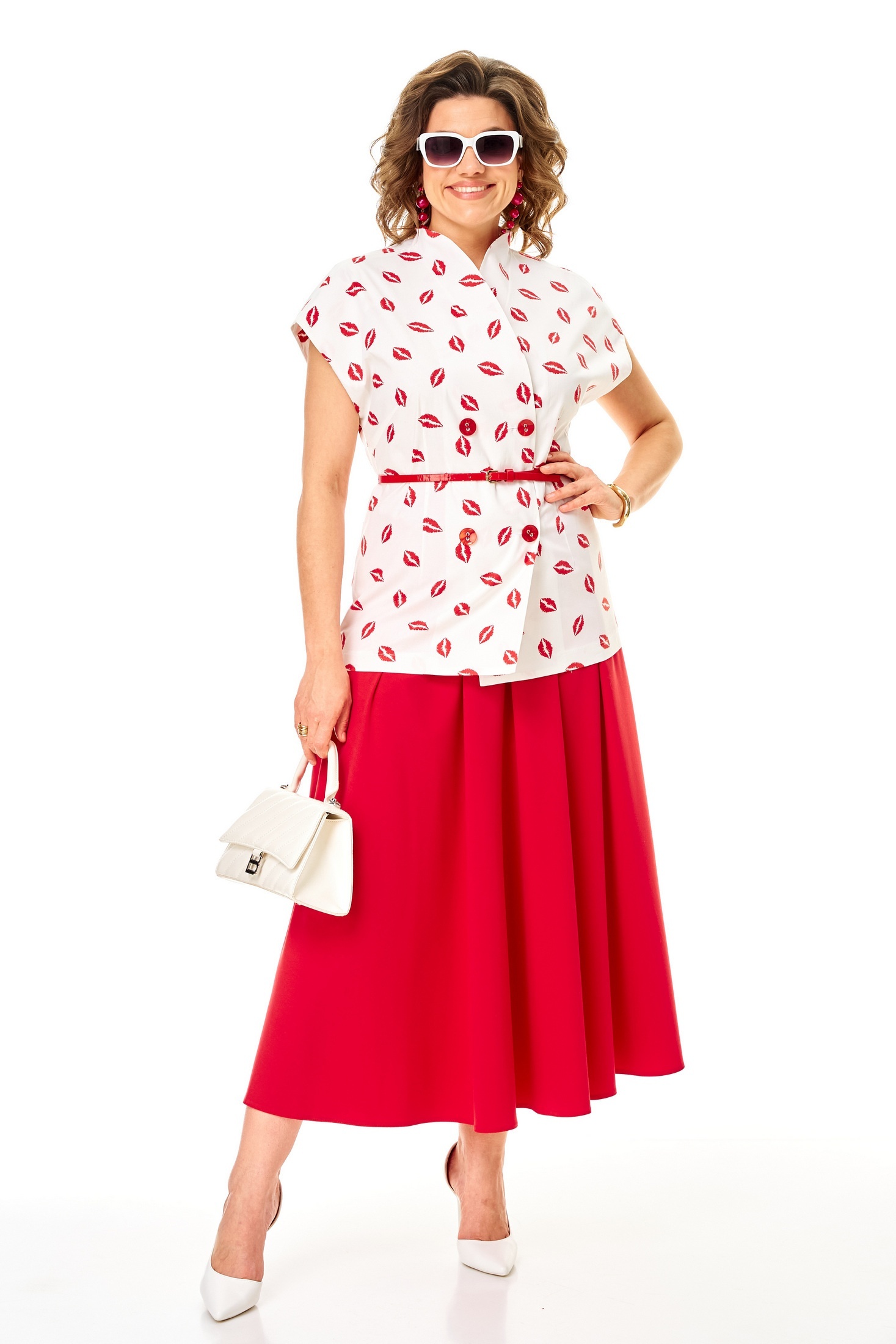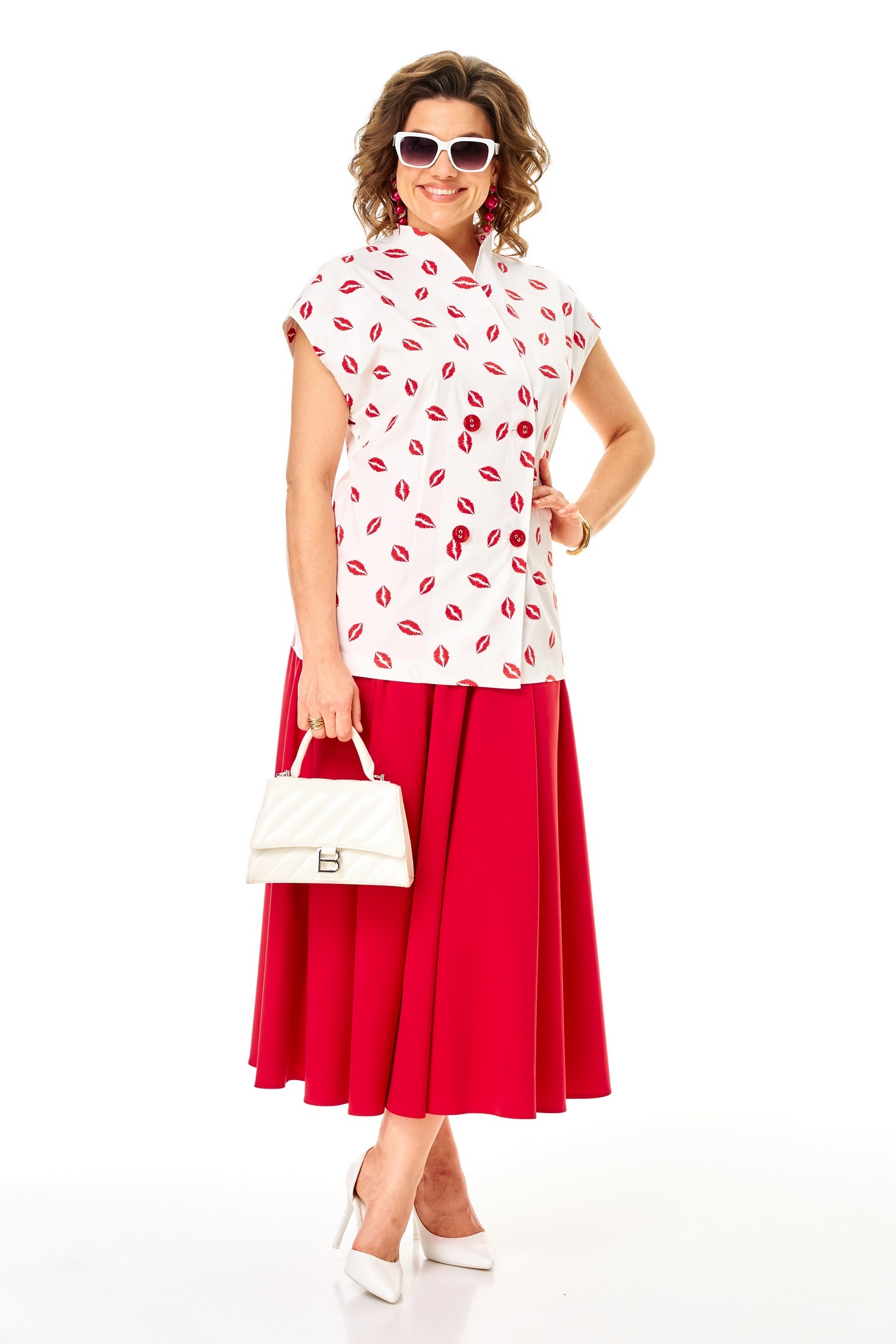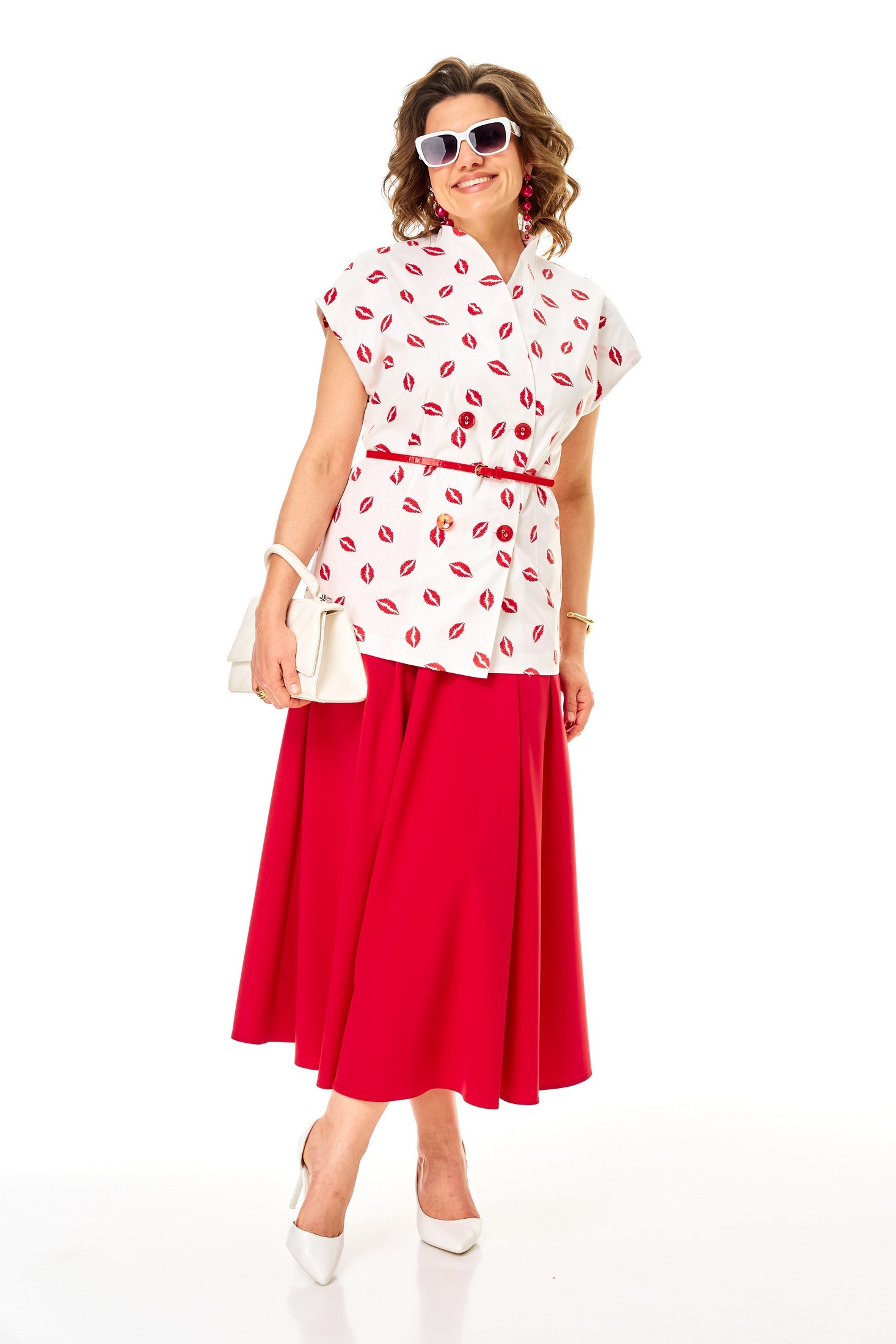 Костюм с юбкой 1354 бело-красный Anastasia от бренда Anastasia — это стильный выбор для повседневного гардероба. Коллекция бренда предлагает женский костюм двойку (жилет и юбка макси), идеально подходящий для работы и прогулок. Жилет выполнен из хлопка с добавлением спандекса, что обеспечивает комфорт и воздухопроницаемость. Двухбортная застежка и цельнокроеная стойка делают его универсальным для летнего сезона. Юбка полусолнце на резинке, дополненная боковыми карманами, позволяет удобно хранить мелочи. Материал юбки — прочный полиэстер с вискозой, добавляющий изделию легкость и изящный вид. Бело-красная цветовая гамма подчеркивает выразительный образ, а длина юбки в 90 см и длина по спинке в 72–74 см обеспечивает комфортное ношение.