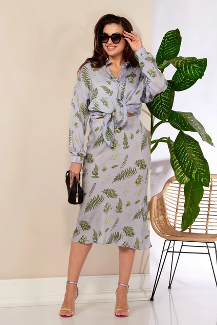 Комплект женский 2-х предметный (блузка, юбка) из блузочной ткани. Блузка прямого силуэта со спущенным плечом. Застежка модели на планку и пуговицы, воротник на стойке, по полочке идет накладной карман, манжет рукава на резинке. Юбка по косой, пояс на резинке. Длина блузки (по спинке): (50-54)-72см. Длина рукава (с манжетой): (50-54)-50см. Длина юбки (50-54)-80 см.