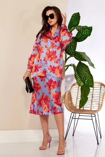 Комплект женский 2-х предметный (блузка, юбка) из атласной ткани. Блузка прямого силуэта со спущенным плечом. Застежка модели на планку и пуговицы, воротник на стойке, по полочке идет накладной карман, манжет рукава на резинке. Юбка по косой, пояс на резинке. Длина блузки (по спинке): (50-54)-72см. Длина рукава (с манжетой): (50-54)-50см. Длина юбки (50-54)-80 см.