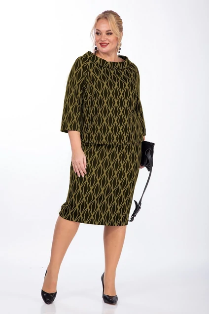 Комплект женский 2-х предметный (жакет, юбка). Модель из трикотажного полотна в ромбы. Жакет прямого силуэта из бокового шва идет грудовая выточка, рукав реглан 3/4 длины, воротник стояче-отложной. Юбка зауженная к низу , на обтачке, сзади молния. В комплект входит сьемная брошь. Длина жакета (по спинке): (52-58)-52см. Длина рукава: (52-58)-53см. Длина юбки:(52-58)-70см.