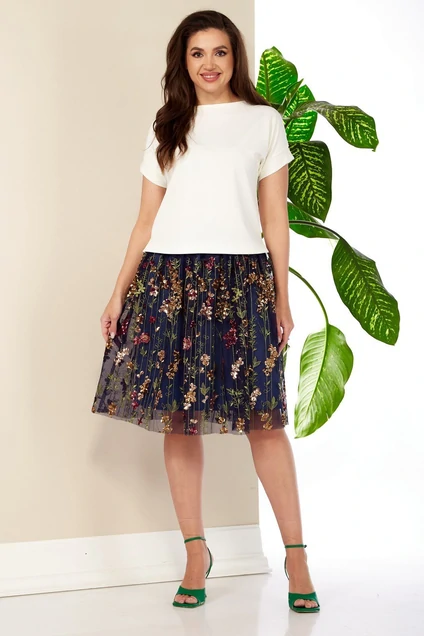 Комплект женский 2-х предметный (блузка, юбка). Блузка из трикотажного полотна прямого силуэта, вырез горловины в форме "лодочки", по бокам разрезы, полочка короче спинки. Юбка из сетки с пайетками, на подкладке , со сборкой, пояс на резинке. Длина блузки (по спинке): (48-52р.)-55 см, (54-56р.)-58 см. Длина рукава (манжеты): (48-56)-4 см. Длина юбки: (48-52)-62см.,(54-)-64см., (56)-66см.