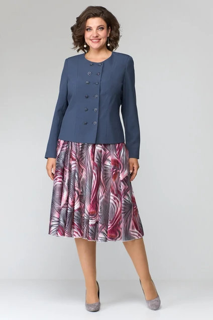 Костюм состоит из жакета и юбки. Жакет полуприлегающего силуэта выполнен из однотонной ткани, жакет на подкладке.