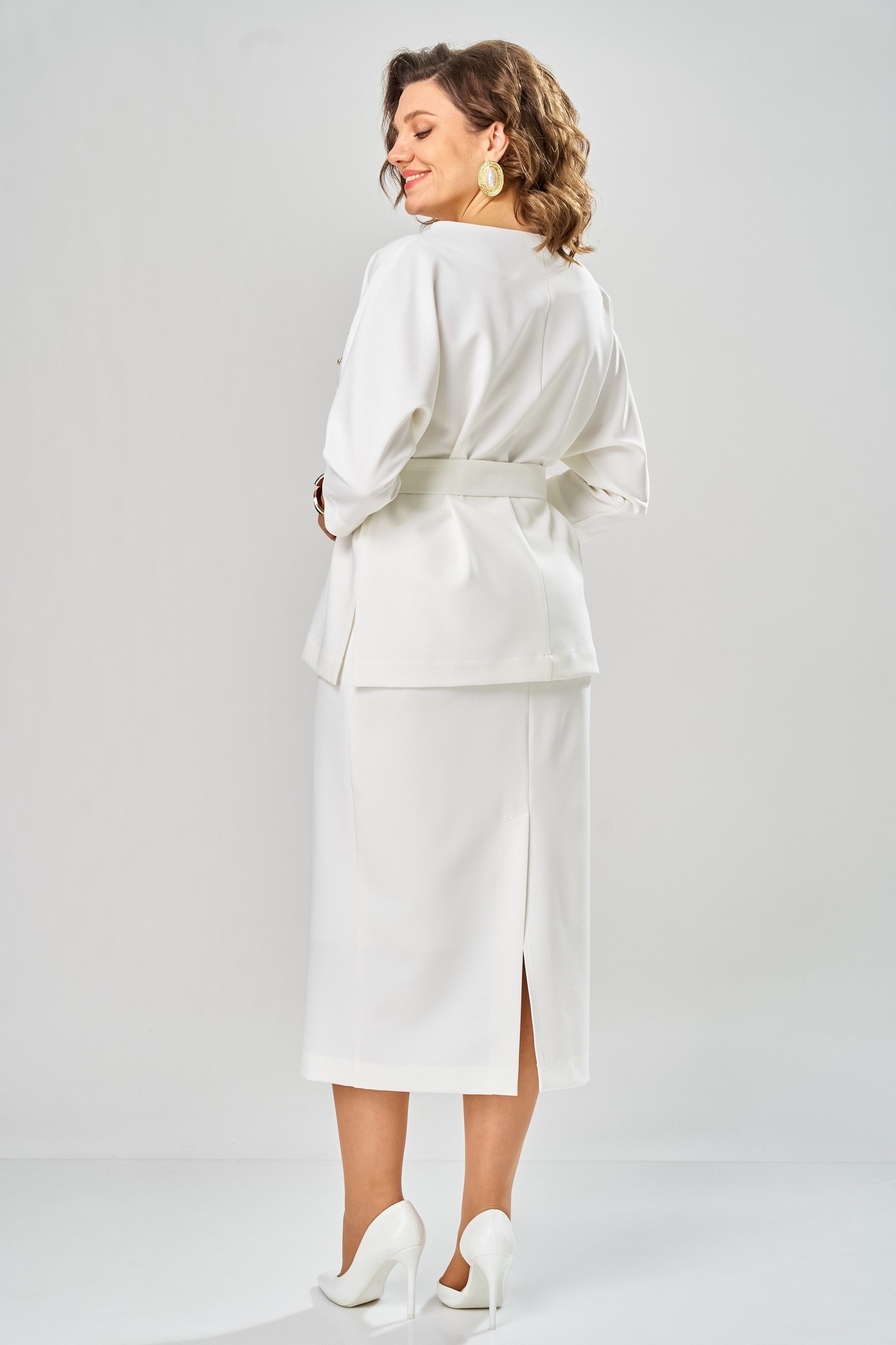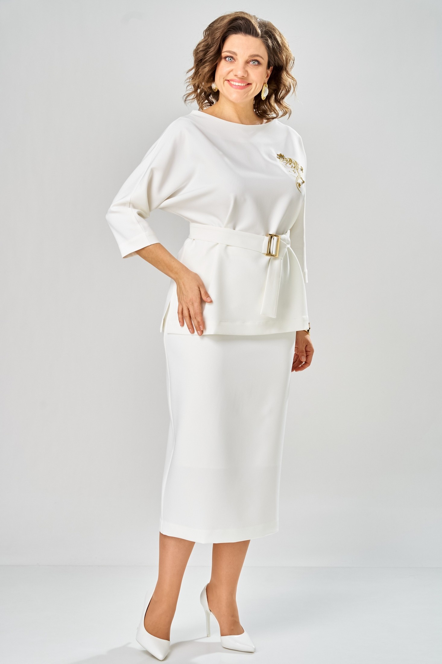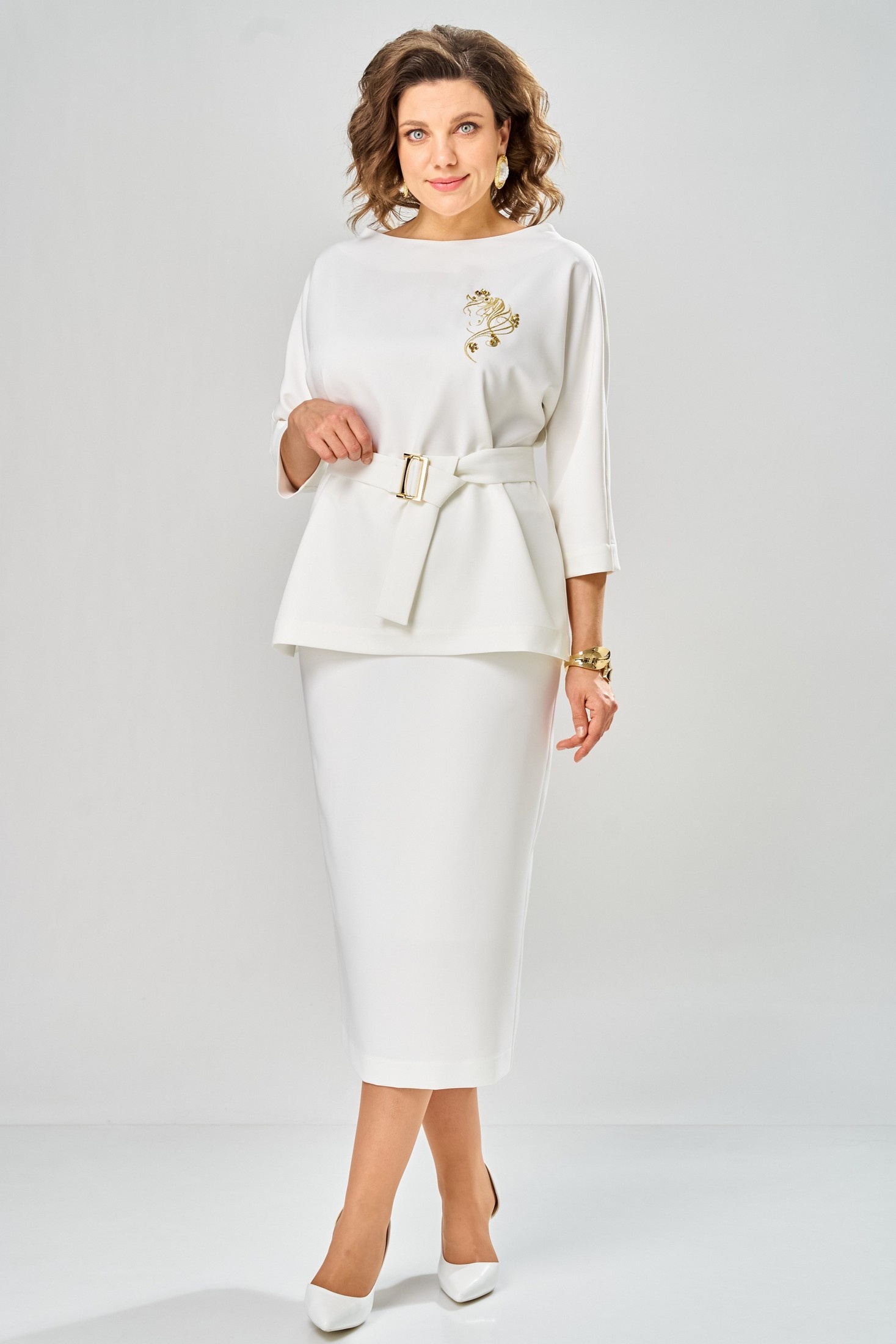 Костюм с юбкой 9091-1-26 молоко ANDINA CITY подчеркнет вашу женственность и стиль. Коллекция бренда ANDINA CITY предлагает идеальное сочетание комфорта и моды. Костюм выполнен из 94% полиэстера и 6% спандекса, что обеспечивает приятное прилегание и долговечность. Прямой крой блузки со съёмным поясом и ¾ рукавами создаёт элегантный силуэт, дополненный нежной дизайнерской вышивкой. Юбка-карандаш длиной миди с притачным поясом и задней молнией удобна в носке и подчеркивает линию талии. Костюм молочного цвета идеально подходит для офисных и прогулочных луков, создавая классический, но современный образ. Подкладка обеспечивает комфорт в прохладные дни, делая костюм отличным выбором для весеннего сезона.