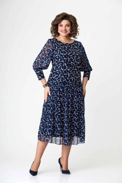 Костюм женский, нарядно-повседневный, выполнен из плательного трикотажа и шифона. Юбка на трикотажной подкладке. Блузка с трех-четвертным рукавом, расширенным к низу на удлиненный манжет. Горловина округлой формы. Перед с нагрудными вытачками, спинка с талиевыми. Юбка с кокеткой на обтачке. Из-под кокетки три яруса присборенных воланов.