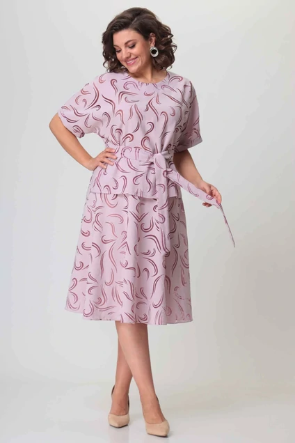 Костюм женский, юбочный нарядно-повседневный Выполнен из плательной ткани. Блузка с круглой горловиной и коротким рукавом, покроя «летучая мышь». В боковых швах блузки разрезы, Блузка под пояс на завязку. Юбка покроя «клеш» на поясе с резинкой. Застежка-молния в боковом шве.