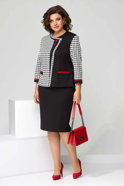 Костюм женский полуприлегающего силуэта, состоящий из джемпера и юбки. Джемпер с округлой горловиной и рукавом три четверти с отделкой по низу. Перед с рельефами и асимметричной имитацией запаха с планкой и пуговицами. Ниже уровня талии, карманы в рамку. Спинка свободная, в центральном шве застежка на тесьму-молнию. Юбка классическая, на поясе с резинкой. По переднему полотнищу вытачки, по заднему - центральный шов с застежкой на тесьму-молнию. Вверху вытачки.