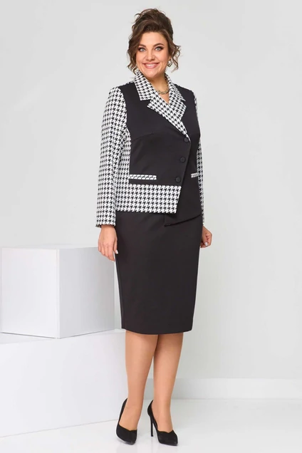 Костюм женский полуприлегающего силуэта из трикотажного полотна двух видов. Рукав длинный, воротник пиджачного типа. Застежка по переду асимметричная, на петли и пуговицы. Перед с бочком и асимметричным подрезом. Ниже уровня талии карман в рамку, имитация. Спинка с центральным швом и вертикальными рельефами из проймы. Юбка прямая классическая, на поясе с резинкой по бокам. По переду талиевые вытачки. По заднему полотнищу шлица и застежка-молния в центральном шве.