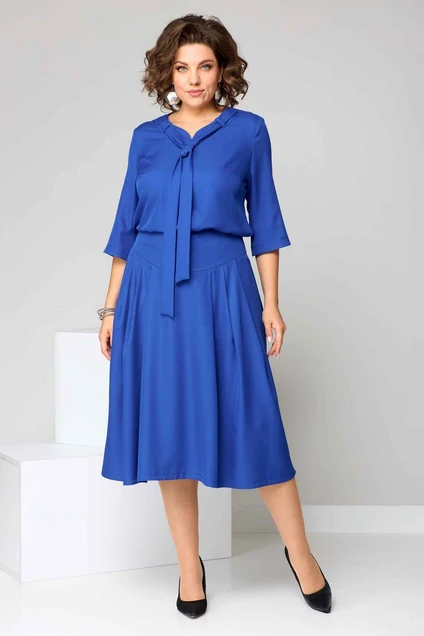 Костюм юбочный (двойка) женский свободного силуэта состоят из блузки и юбки. Костюм выполнен из тонкой костюмной ткани. Блузка с рукавом 3/4 на манжете. Горловина с V-образным вырезом с фигурными вставками и галстуком на завязке. По планке две шлевки для закрепления галстука. Нагрудные вытачки из бокового шва. Спинка свободная. Юбка на фигурной кокетке, из-под которой складки и косые карманы. Застежка на тесьму-молнию в боковом шве.
