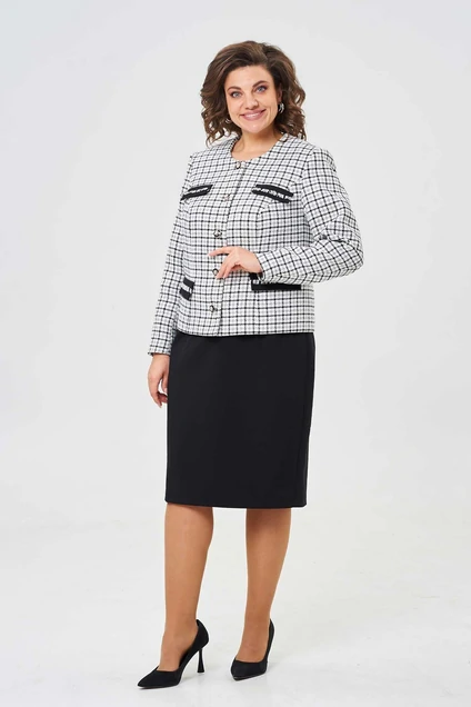 Костюм юбочный (двойка) женский полуприлегающего силуэта состоят из жакета и юбки. Состоит из костюмной ткани двух фактур. Жакет с длинным рукавом. Горловина округлая. Застежка центральная на пуговицы по переду. Из проймы до низа рельефы. В области груди и ниже уровня талии имитация карманов. Спинка с центральным швом и рельефами. Жакет на подкладке. Юбка классическая, зауженная к низу. Пояс на резинке. Переднее полотнище с талиевыми вытачкаим. В центральном шве заднего полотнища застежка на тесьму-молнию и шлица. Юбка на подкладке.