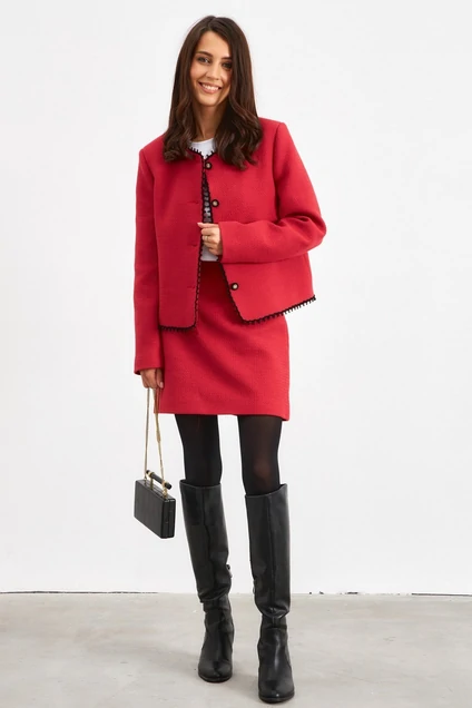 Комплект из жакета и юбки, выполнен из фактурной ткани. Жакет прямого кроя, выполнен из фактурной ткани в красном цвете. По переду застежка на стильные дизайнерские пуговицы. Рукав втачной, по краю всего изделия кант. Юбка А-образного силуэта, выполнена из фактурной ткани, красного цвета, юбка с потайной молнией.