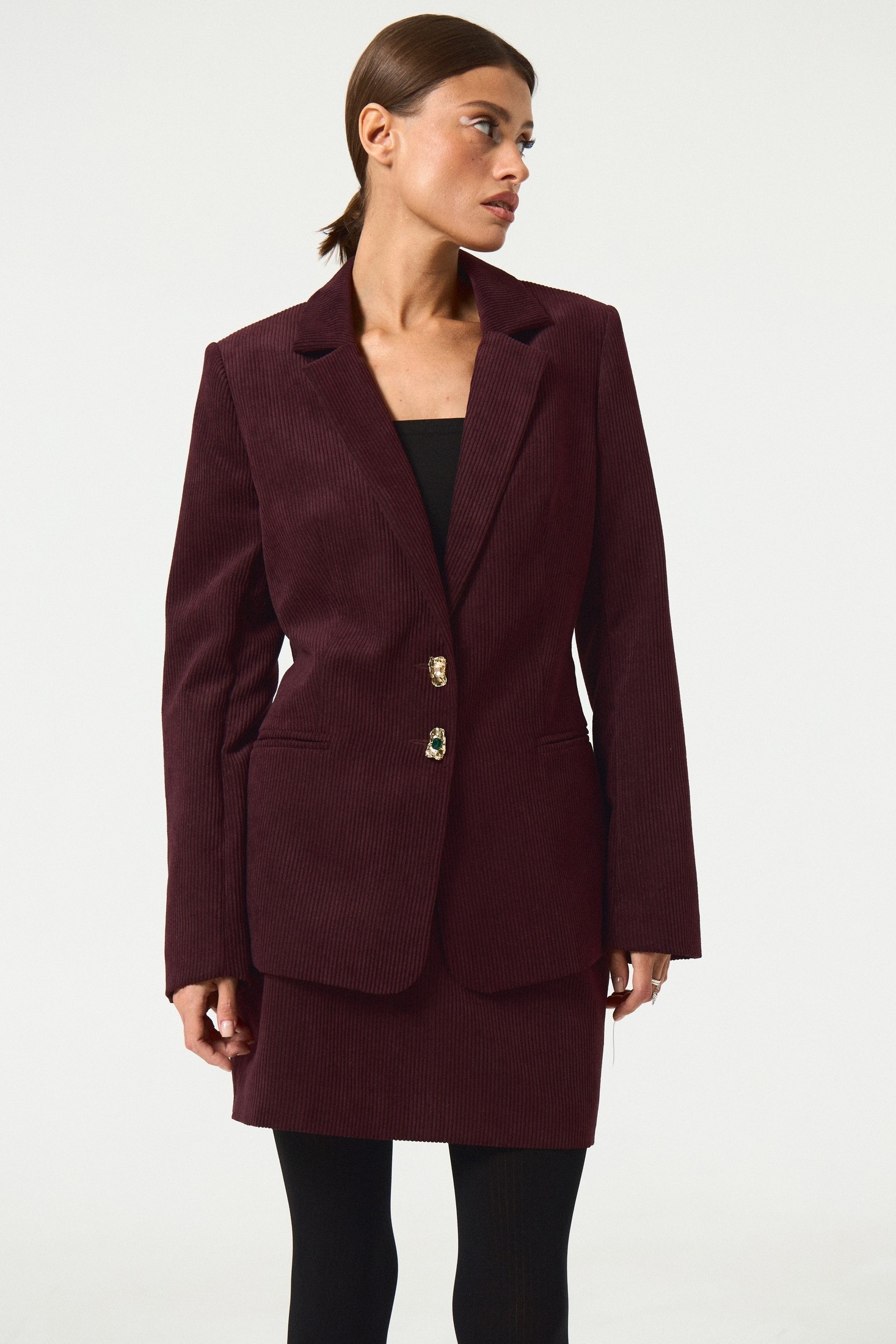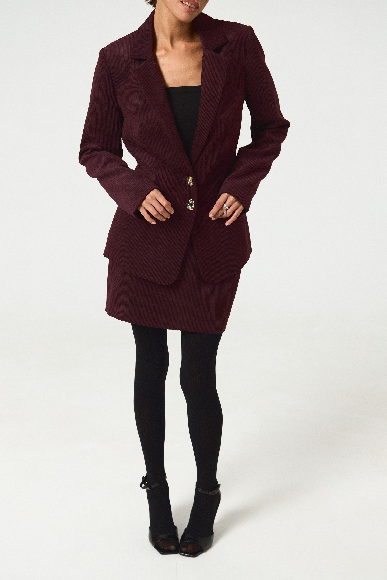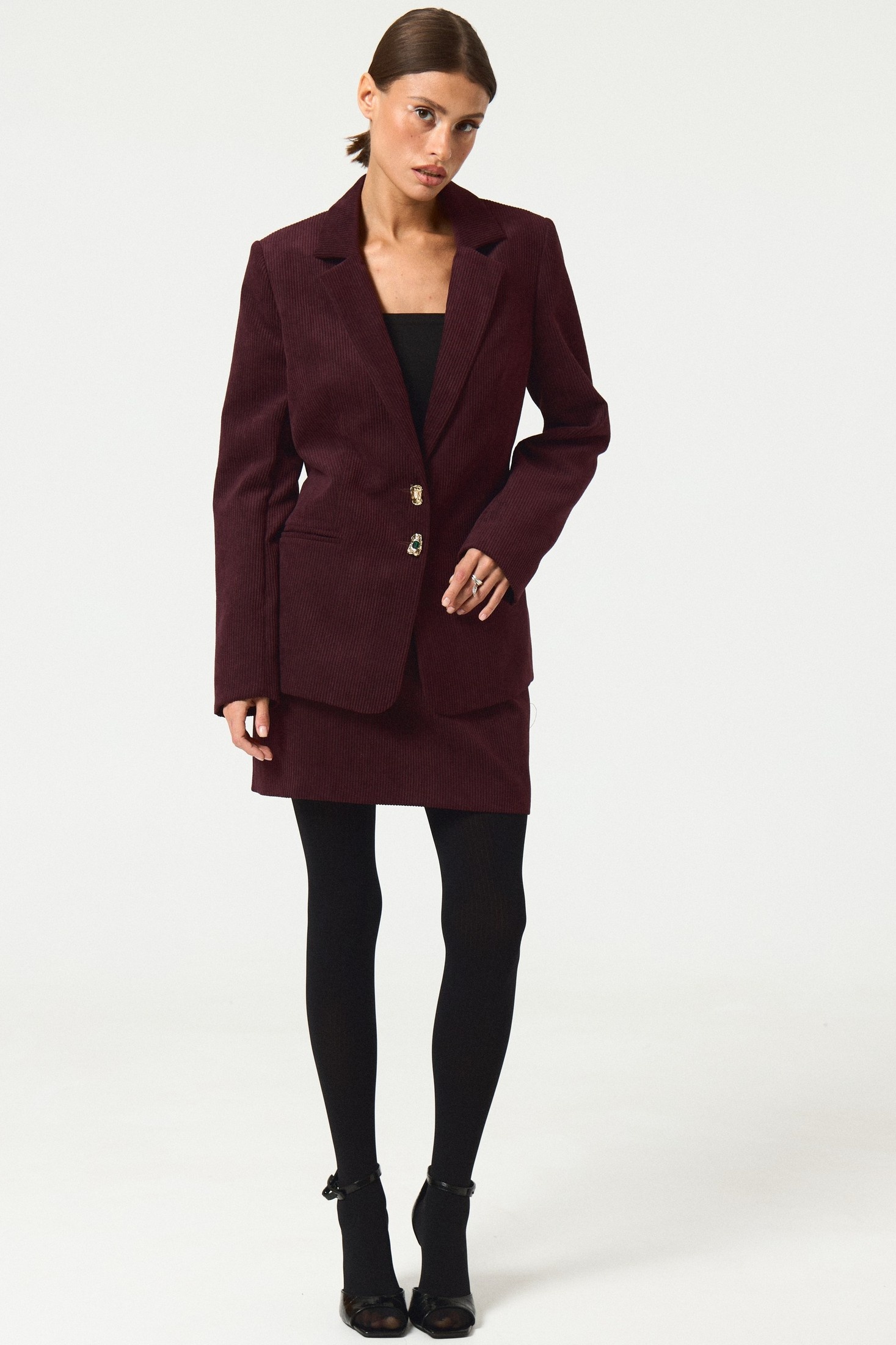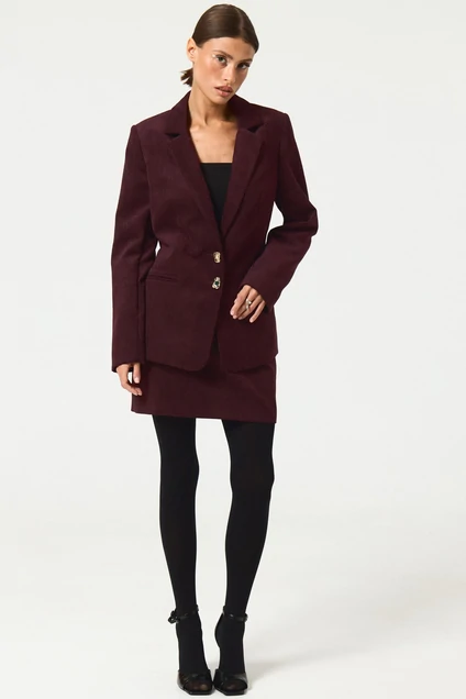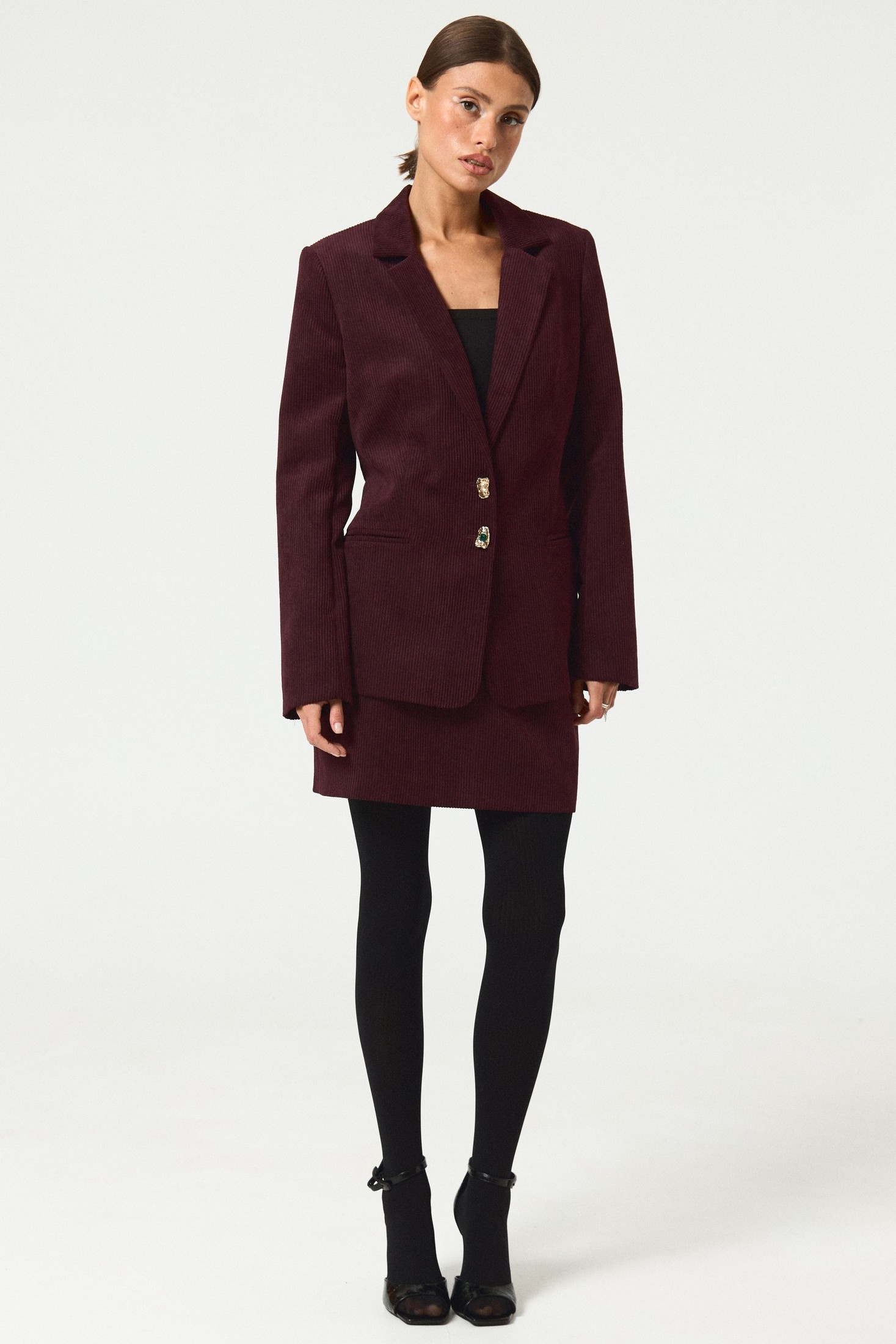 Жакет полуприлегающего силуэта, удлиненный. По переду функциональные карманы с обтачкой. Застежка на 2 пуговицы. Воротник с отложными лацканами, длинный рукав, на подкладке. Разрезов на спинке нет. Рельефы по переду и по спинке. Юбка в длине мини с застежкой на молнию