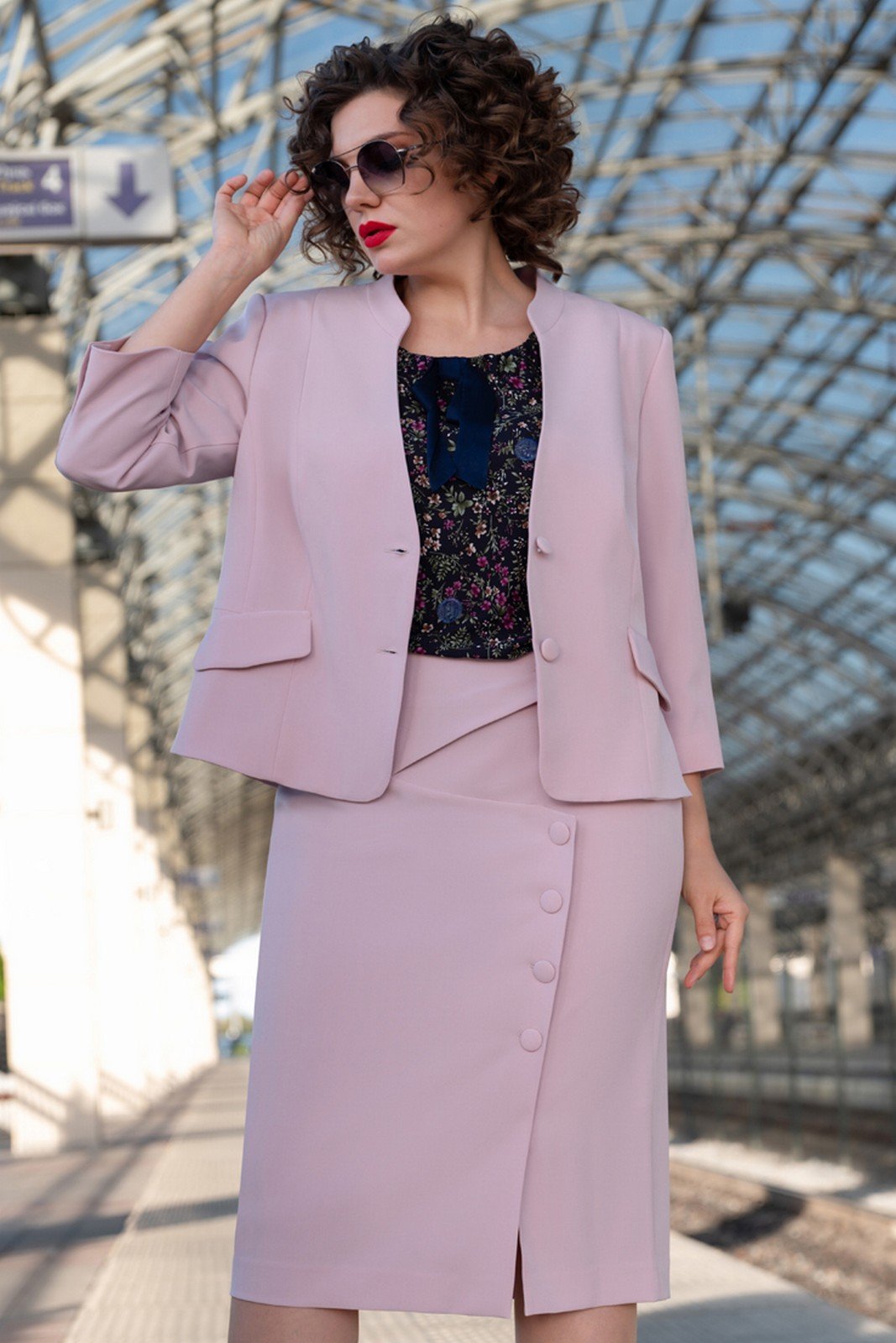 Комплект-двойка: жакет+юбка. Юбка-карандаш, ткань костюмно-плательная, плотность средняя, немного тянется. Застежка на молнию в боковом шве. На переде шлица. Жакет из костюмно-плательной ткани средней плотности, немного тянется, на подкладе, застежка на петли/пуговицы. Длина жакета 54 см, длина рукава 48 см.