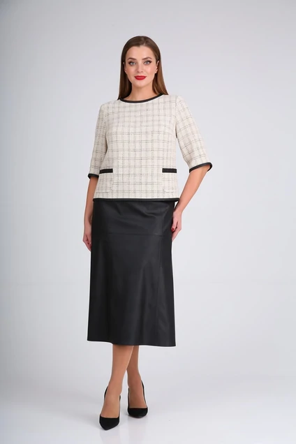 Стильный комплект из юбки и блузы. Блуза прямого силуэта. Горловина типа лодочка. Рукава, горловина и низ блузы окантованы эко-кожей. По блузе, ниже линии талии, выполнены накладные карманы с листочкой. Спинка со средним швом, по верхней части застежка молния. Юбка на удлинённой кокетке. Низ юбки слегка расклешен. Спинка со средним швом на молнии. Все швы юбки отстрочены отделочной нитью.