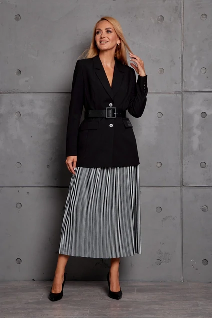 Комплект женский, состоящий из жакета и юбки. Со съёмным поясом. Жакет полуприлегающего силуэта, свободный, удлинённый, однобортный с застёжкойна пуговицы, с отложным воротником, с карманами по переду, рукав втачной со шлицей и пуговицами. Изделие на подкладке. Юбка из плесерованной ткани в мелкую полоску, на поясе, с застёжкой на молнии в боковом шве, длина "midi", без подкладки.