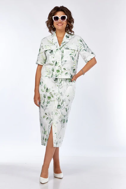 Юбка прямая длиной ниже середины икры.Переднее полотнище юбки состоит из двух деталей с планками и декоративными пуговицами,и карманами с отрезными бочками.Заднее полотнище со средним швом и застёжкой на потайную тесьму-молнию и петлю и пуговицу,с вытачками и накладными карманами.Юбка на притачном поясе с резинкой в области боковых швов.