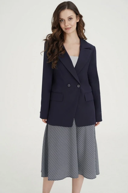 Жакет на подкладке. Застежка двубортная на две пуговицы. Воротник пиджачный. Рукав втачной двухшовный. По полочкам прорезные карманы с клапаном.