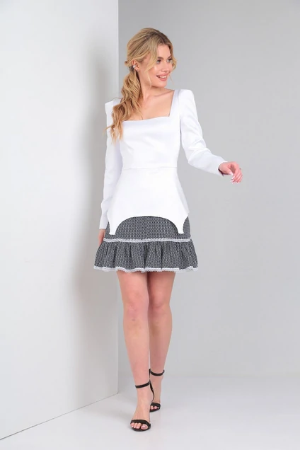 Юбка короткая, на притачном поясе с эластичной тесьмой. По низу юбки притачной волан на сборке, декорированный кружевной тесьмой.